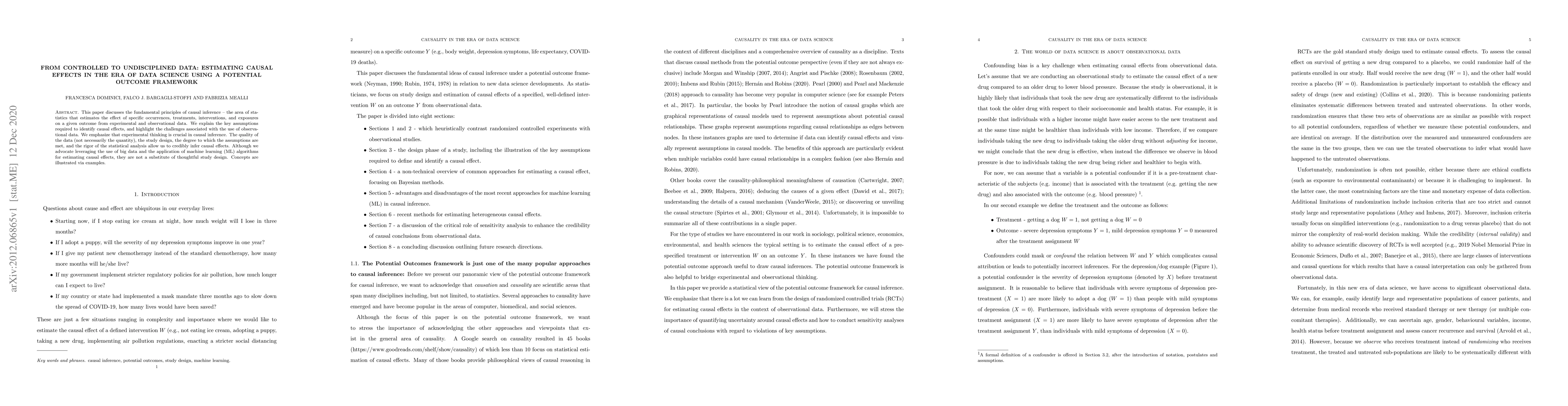 This paper discusses the fundamental principles of causal inference - the area of statistics that estimates the effect of specific occurrences, treatments, interventions, and exposures on a given outcome from experimental and observational data. We explain the key assumptions required to identify causal effects, and highlight the challenges associated with the use of observational data. We emphasize that experimental thinking is crucial in causal inference. The quality of the data (not necessarily the quantity), the study design, the degree to which the assumptions are met, and the rigor of the statistical analysis allow us to credibly infer causal effects. Although we advocate leveraging the use of big data and the application of machine learning (ML) algorithms for estimating causal effects, they are not a substitute of thoughtful study design. Concepts are illustrated via examples.