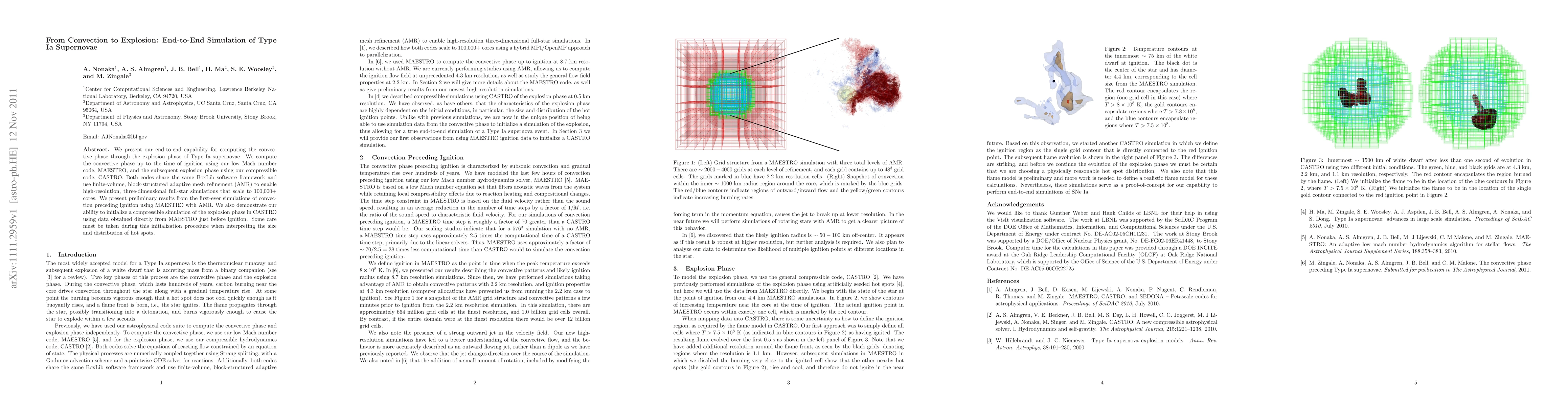We present our end-to-end capability for computing the convective phase through the explosion phase of Type Ia supernovae. We compute the convective phase up to the time of ignition using our low Mach number code, MAESTRO, and the subsequent explosion phase using our compressible code, CASTRO. Both codes share the same BoxLib software framework and use finite-volume, block-structured adaptive mesh refinement (AMR) to enable high-resolution, three-dimensional full-star simulations that scale to 100,000+ cores. We present preliminary results from the first-ever simulations of convection preceding ignition using MAESTRO with AMR. We also demonstrate our ability to initialize a compressible simulation of the explosion phase in CASTRO using data obtained directly from MAESTRO just before ignition. Some care must be taken during this initialization procedure when interpreting the size and distribution of hot spots.
