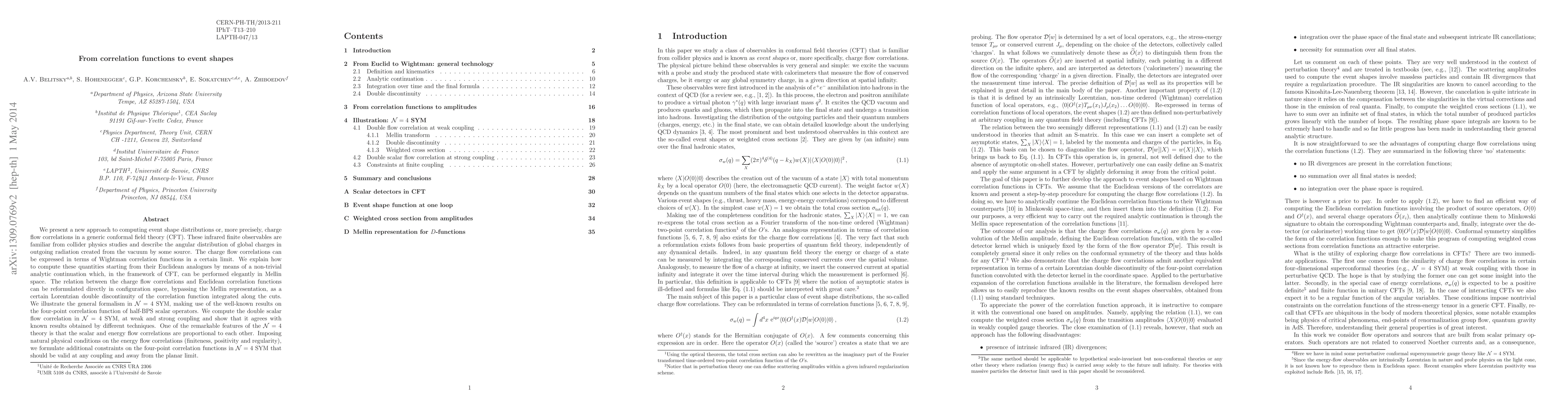 We present a new approach to computing event shape distributions or, more precisely, charge flow correlations in a generic conformal field theory (CFT). These infrared finite observables are familiar from collider physics studies and describe the angular distribution of global charges in outgoing radiation created from the vacuum by some source. The charge flow correlations can be expressed in terms of Wightman correlation functions in a certain limit. We explain how to compute these quantities starting from their Euclidean analogues by means of a non-trivial analytic continuation which, in the framework of CFT, can elegantly be performed in Mellin space. The relation between the charge flow correlations and Euclidean correlation functions can be reformulated directly in configuration space, bypassing the Mellin representation, as a certain Lorentzian double discontinuity of the correlation function integrated along the cuts. We illustrate the general formalism in N=4 SYM, making use of the well-known results on the four-point correlation function of half-BPS scalar operators. We compute the double scalar flow correlation in N=4 SYM, at weak and strong coupling and show that it agrees with known results obtained by different techniques. One of the remarkable features of the N=4 theory is that the scalar and energy flow correlations are proportional to each other. Imposing natural physical conditions on the energy flow correlations (finiteness, positivity and regularity), we formulate additional constraints on the four-point correlation functions in N=4 SYM that should be valid at any coupling and away from the planar limit.