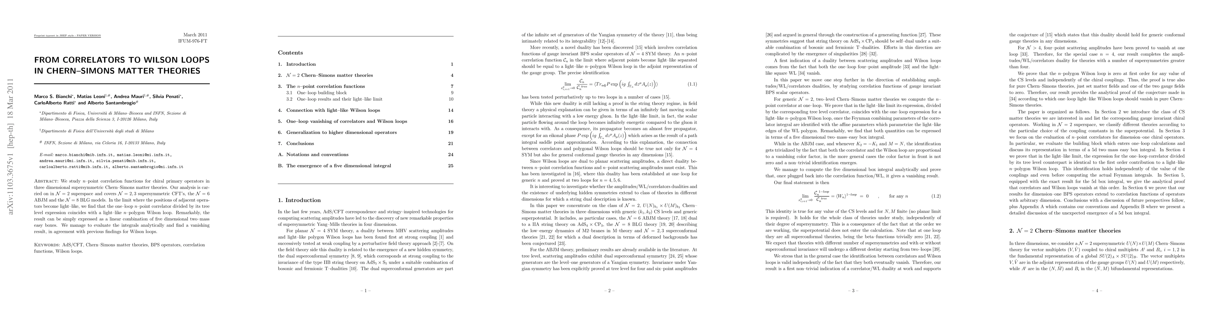 This paper investigates n-point correlation functions of chiral primary operators in three-dimensional supersymmetric Chern-Simons matter theories, revealing that the one-loop correlator, when adjacent operators are light-like, corresponds to a light-like n-polygon Wilson loop. Analytical evaluation confirms a vanishing result, consistent with prior findings on Wilson loops.