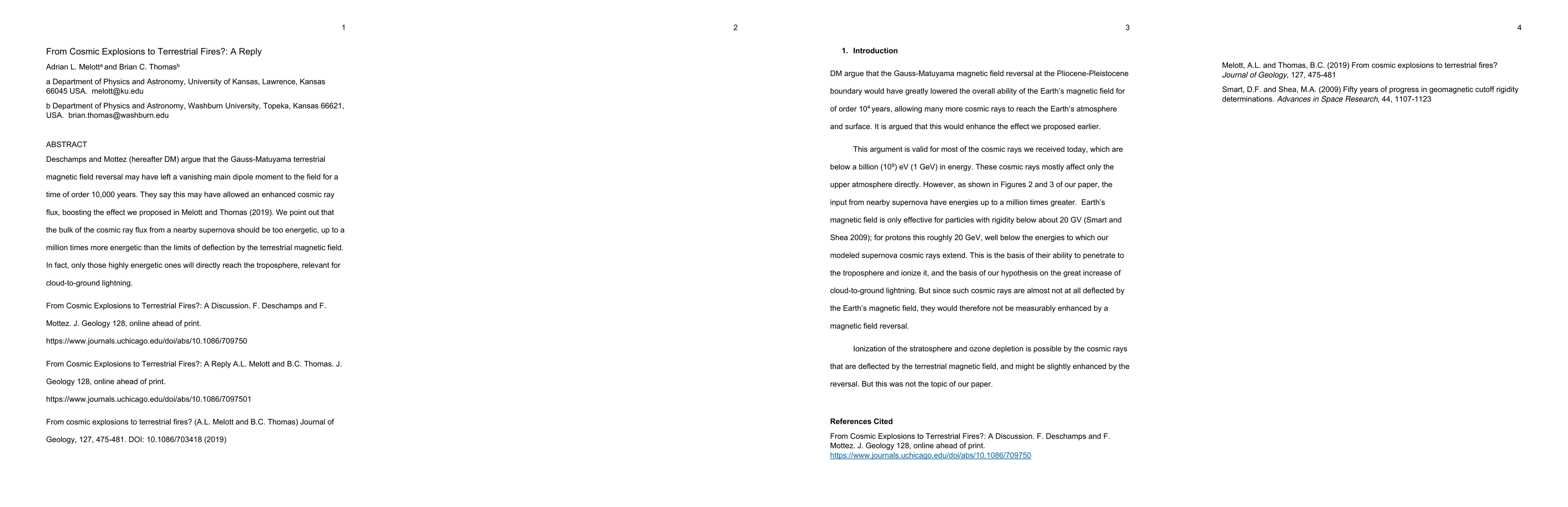 Deschamps and Mottez (hereafter DM) argue that the Gauss-Matuyama terrestrial magnetic field reversal may have left a vanishing main dipole moment to the field for a time of order 10,000 years. They say this may have allowed an enhanced cosmic ray flux, boosting the effect we proposed in Melott and Thomas (2019). We point out that the bulk of the cosmic ray flux from a nearby supernova should be too energetic, up to a million times more energetic than the limits of deflection by the terrestrial magnetic field. In fact, only those highly energetic ones will directly reach the troposphere, relevant for cloud-to-ground lightning. From Cosmic Explosions to Terrestrial Fires?: A Discussion. F. Deschamps and F. Mottez. J. Geology 128, online ahead of print. (2020) From Cosmic Explosions to Terrestrial Fires?: A Reply A.L. Melott and B.C. Thomas. J. Geology 128, online ahead of print. (2020) From cosmic explosions to terrestrial fires? (A.L. Melott and B.C. Thomas) Journal of Geology, 127, 475-481 10.1086/703418 (2019) [arXiv:1903.01501]