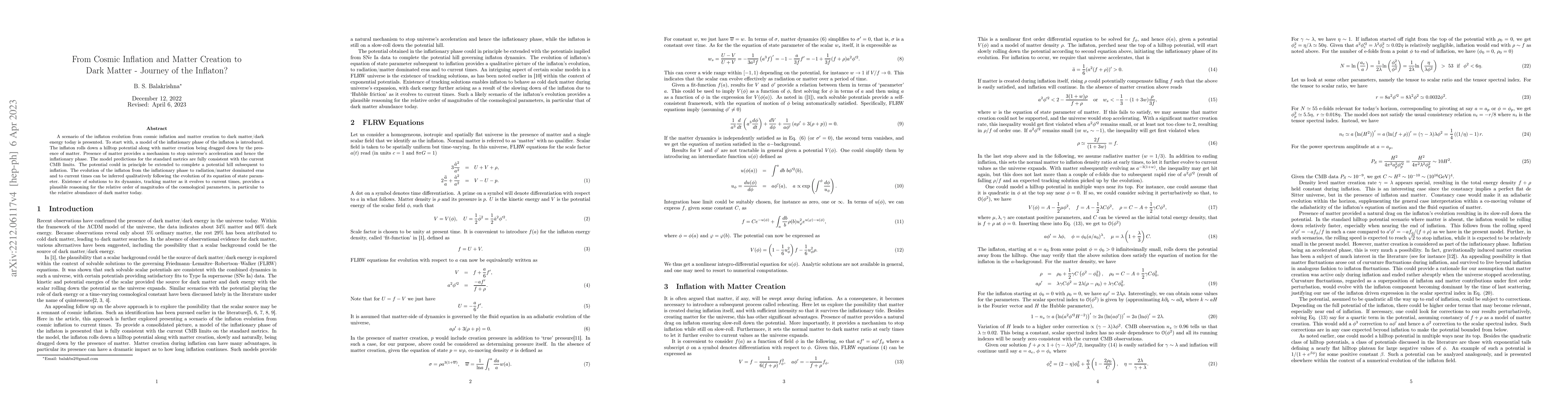 This paper explores the evolution of the inflaton from cosmic inflation through matter creation to the present-day dark matter, proposing a model where the inflaton's potential influences the universe's acceleration and its transition from inflationary to radiation/matter-dominated phases. The model aligns with current CMB data and offers insights into the relative abundance of dark matter today.