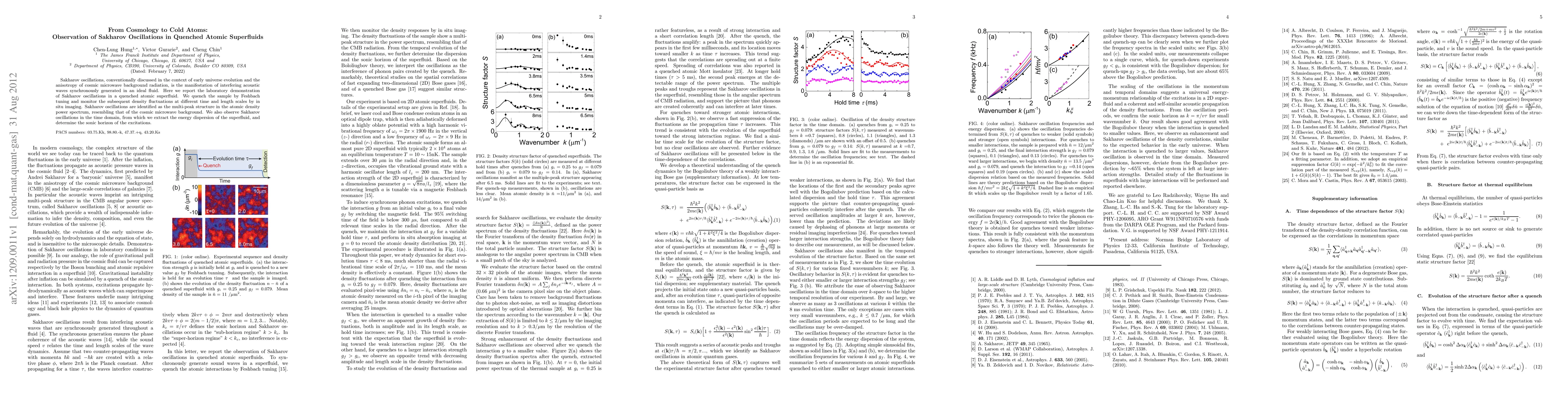 Sakharov oscillations, conventionally discussed in the context of early universe evolution and the anisotropy of cosmic microwave background radiation, is the manifestation of interfering acoustic waves synchronously generated in an ideal fluid. Here we report the laboratory demonstration of Sakharov oscillations in a quenched atomic superfluid. We quench the sample by Feshbach tuning and monitor the subsequent density fluctuations at different time and length scales by in situ imaging. Sakharov oscillations are identified as the multi-peak structure in the atomic density power spectrum, resembling that of the cosmic microwave background. We also observe Sakharov oscillations in the time domain, from which we extract the energy dispersion of the superfluid, and determine the sonic horizon of the excitations.
