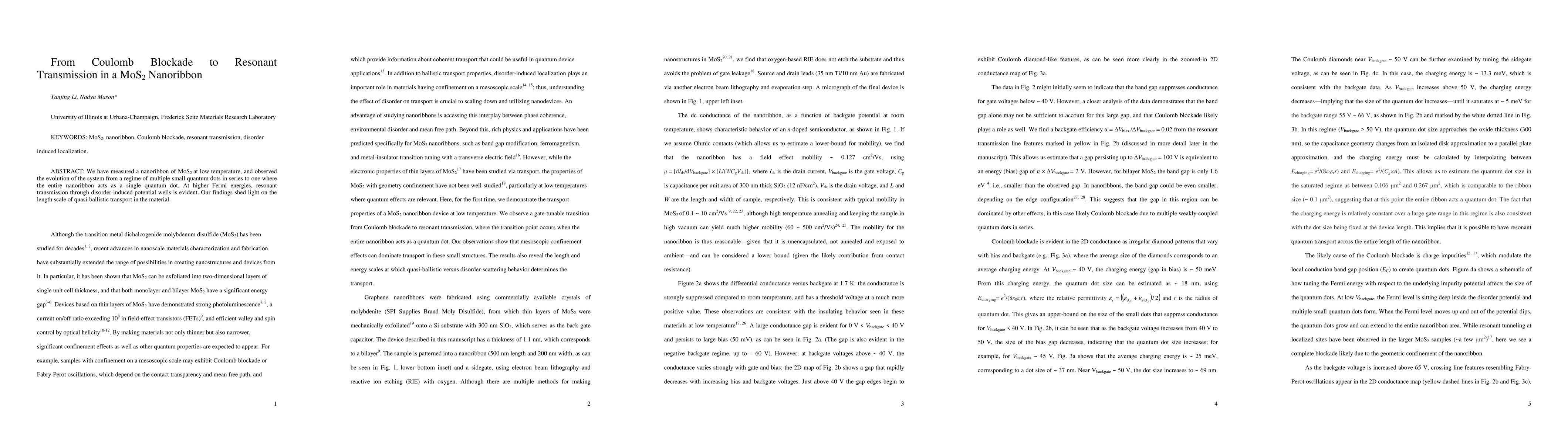 Researchers observed MoS2 nanoribbons exhibiting a shift from multiple quantum dots to single-dot behavior at low temperatures, revealing resonant transmission through disorder-induced potential wells.