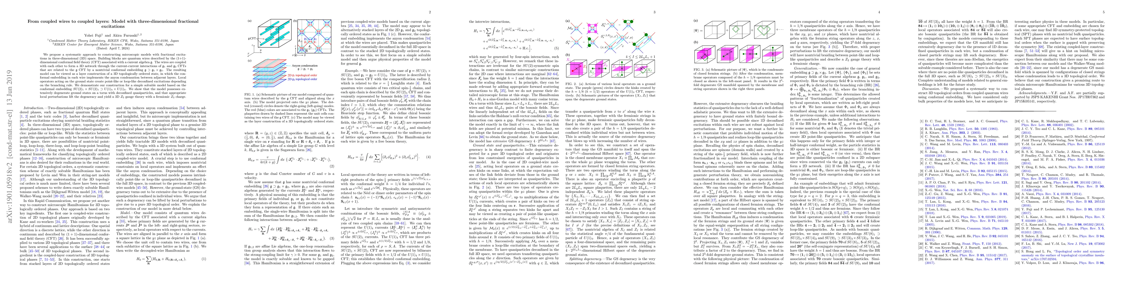 We propose a systematic approach to constructing microscopic models with fractional excitations in three-dimensional (3D) space. Building blocks are quantum wires described by the (1+1)-dimensional conformal field theory (CFT) associated with a current algebra $\mathfrak{g}$. The wires are coupled with each other to form a 3D network through the current-current interactions of $\mathfrak{g}_1$ and $\mathfrak{g}_2$ CFTs that are related to the $\mathfrak{g}$ CFT by a nontrivial conformal embedding $\mathfrak{g} \supset \mathfrak{g}_1 \times \mathfrak{g}_2$. The resulting model can be viewed as a layer construction of a 3D topologically ordered state, in which the conformal embedding in each wire implements the anyon condensation between adjacent layers. Local operators acting on the ground state create point-like or loop-like deconfined excitations depending on the branching rule. We demonstrate our construction for a simple solvable model based on the conformal embedding $SU(2)_1 \times SU(2)_1 \supset U(1)_4 \times U(1)_4$. We show that the model possesses extensively degenerate ground states on a torus with deconfined quasiparticles, and that appropriate local perturbations lift the degeneracy and yield a 3D $Z_2$ gauge theory with a fermionic $Z_2$ charge.