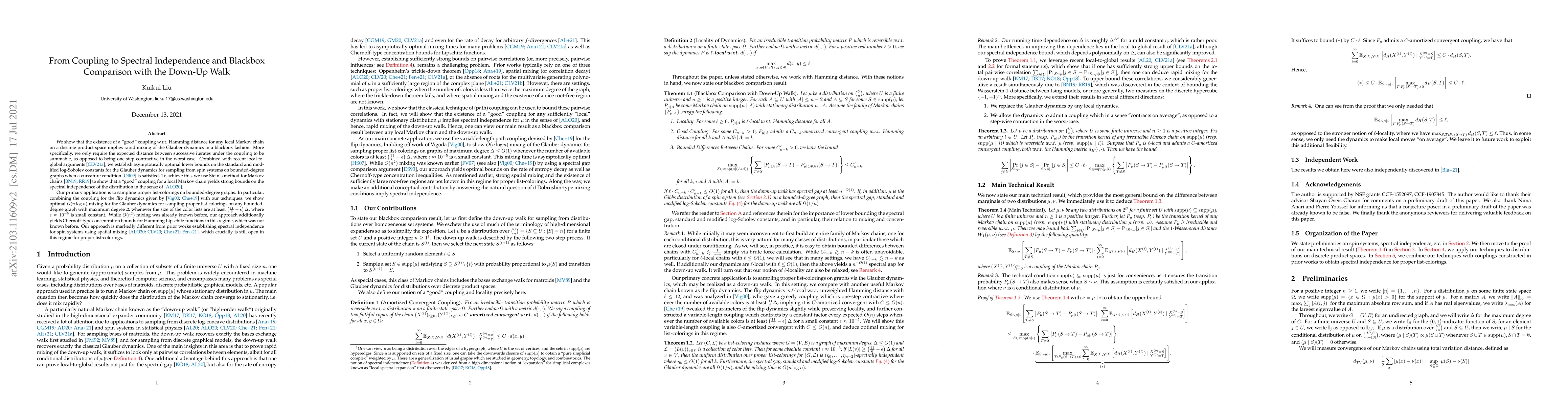 We show that the existence of a "good"' coupling w.r.t. Hamming distance for any local Markov chain on a discrete product space implies rapid mixing of the Glauber dynamics in a blackbox fashion. More specifically, we only require the expected distance between successive iterates under the coupling to be summable, as opposed to being one-step contractive in the worst case. Combined with recent local-to-global arguments \cite{CLV21}, we establish asymptotically optimal lower bounds on the standard and modified log-Sobolev constants for the Glauber dynamics for sampling from spin systems on bounded-degree graphs when a curvature condition \cite{Oll09} is satisfied. To achieve this, we use Stein's method for Markov chains \cite{BN19, RR19} to show that a "good" coupling for a local Markov chain yields strong bounds on the spectral independence of the distribution in the sense of \cite{ALO20}. Our primary application is to sampling proper list-colorings on bounded-degree graphs. In particular, combining the coupling for the flip dynamics given by \cite{Vig00, CDMPP19} with our techniques, we show optimal $O(n\log n)$ mixing for the Glauber dynamics for sampling proper list-colorings on any bounded-degree graph with maximum degree $\Delta$ whenever the size of the color lists are at least $\left(\frac{11}{6} - \epsilon\right)\Delta$, where $\epsilon \approx 10^{-5}$ is small constant. While $O(n^{2})$ mixing was already known before, our approach additionally yields Chernoff-type concentration bounds for Hamming Lipschitz functions in this regime, which was not known before. Our approach is markedly different from prior works establishing spectral independence for spin systems using spatial mixing \cite{ALO20, CLV20, CGSV20, FGYZ20}, which crucially is still open in this regime for proper list-colorings.