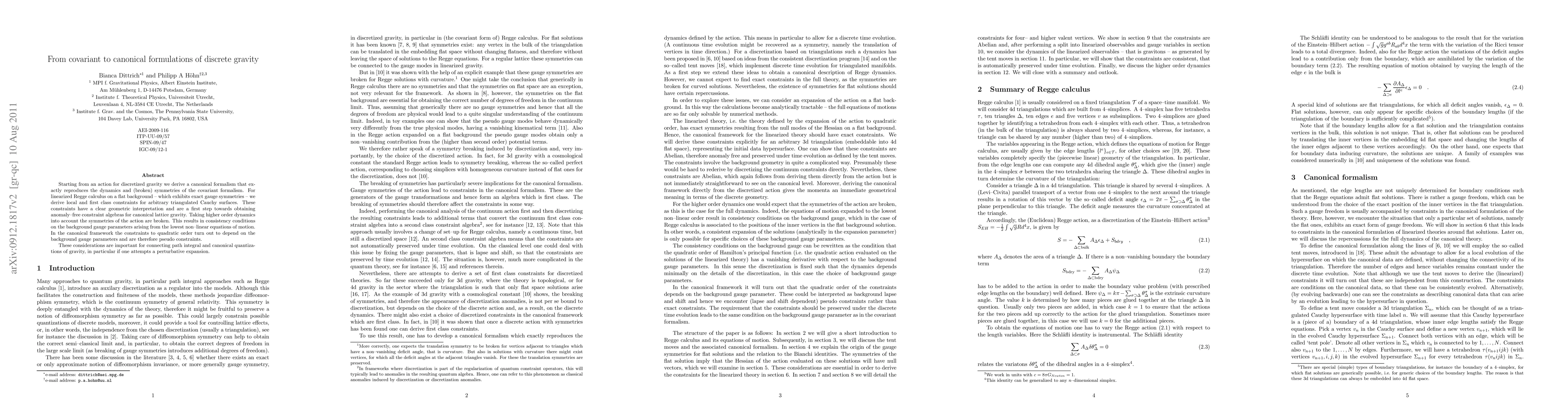 Starting from an action for discretized gravity we derive a canonical formalism that exactly reproduces the dynamics and (broken) symmetries of the covariant formalism. For linearized Regge calculus on a flat background -- which exhibits exact gauge symmetries -- we derive local and first class constraints for arbitrary triangulated Cauchy surfaces. These constraints have a clear geometric interpretation and are a first step towards obtaining anomaly--free constraint algebras for canonical lattice gravity. Taking higher order dynamics into account the symmetries of the action are broken. This results in consistency conditions on the background gauge parameters arising from the lowest non--linear equations of motion. In the canonical framework the constraints to quadratic order turn out to depend on the background gauge parameters and are therefore pseudo constraints. These considerations are important for connecting path integral and canonical quantizations of gravity, in particular if one attempts a perturbative expansion.