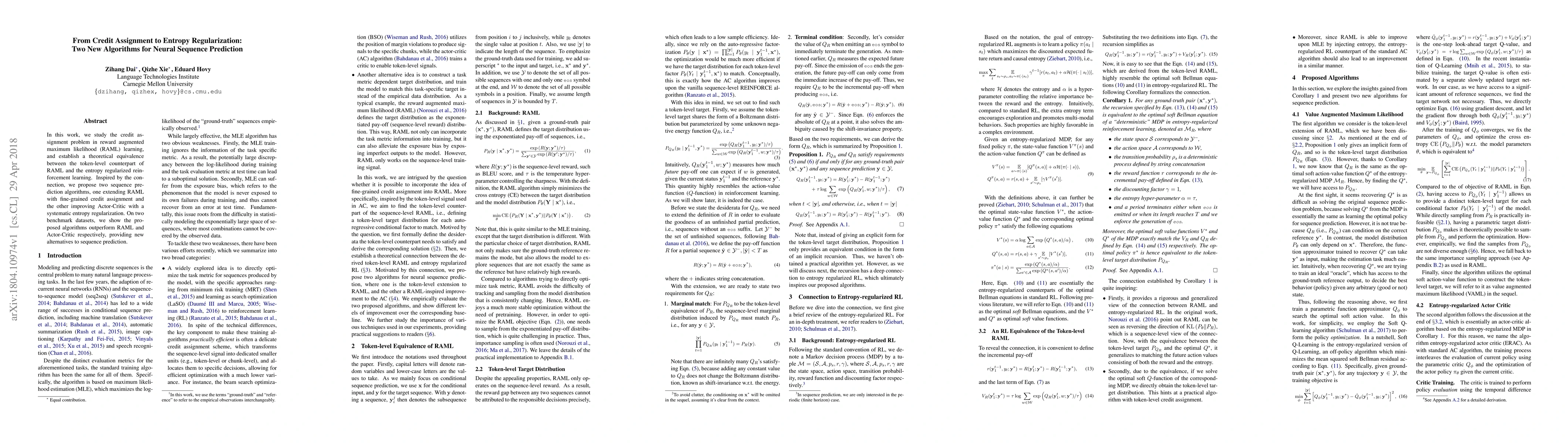 This paper proposes two new algorithms for neural sequence prediction, addressing the credit assignment problem in RAML learning. It establishes a theoretical link between RAML and entropy regularized reinforcement learning, leading to improved sequence prediction performance on benchmark datasets.