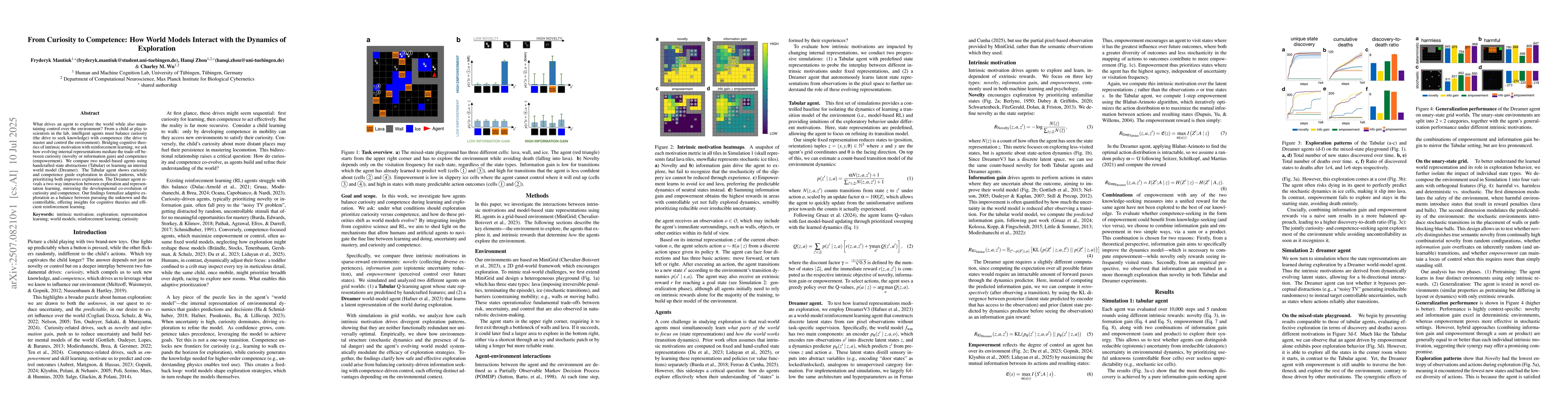 What drives an agent to explore the world while also maintaining control over the environment? From a child at play to scientists in the lab, intelligent agents must balance curiosity (the drive to seek knowledge) with competence (the drive to master and control the environment). Bridging cognitive theories of intrinsic motivation with reinforcement learning, we ask how evolving internal representations mediate the trade-off between curiosity (novelty or information gain) and competence (empowerment). We compare two model-based agents using handcrafted state abstractions (Tabular) or learning an internal world model (Dreamer). The Tabular agent shows curiosity and competence guide exploration in distinct patterns, while prioritizing both improves exploration. The Dreamer agent reveals a two-way interaction between exploration and representation learning, mirroring the developmental co-evolution of curiosity and competence. Our findings formalize adaptive exploration as a balance between pursuing the unknown and the controllable, offering insights for cognitive theories and efficient reinforcement learning.