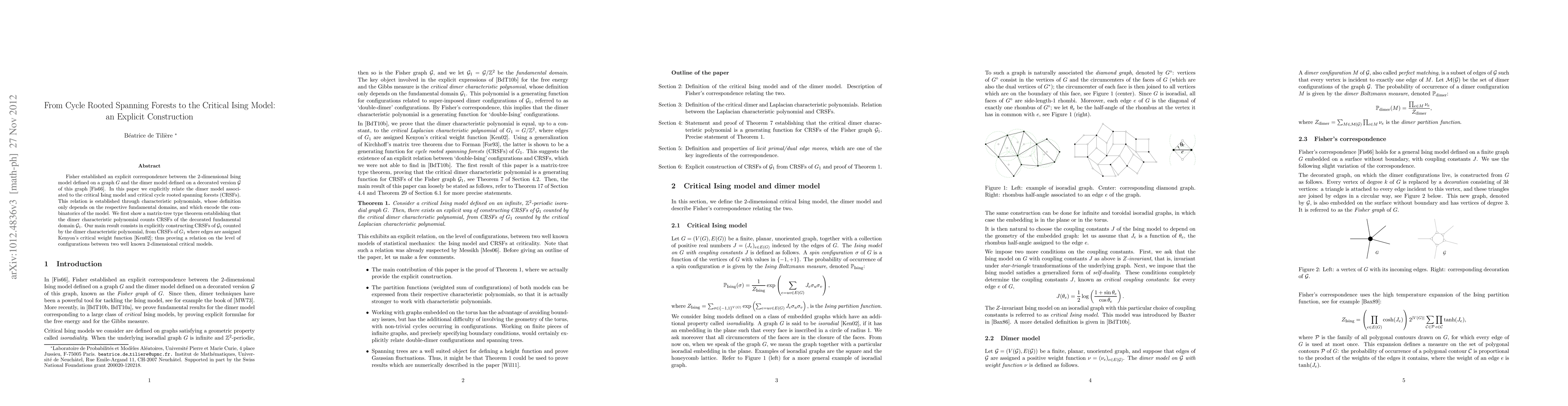 Fisher established an explicit correspondence between the 2-dimensional Ising model defined on a graph $G$ and the dimer model defined on a decorated version $\GD$ of this graph \cite{Fisher}. In this paper we explicitly relate the dimer model associated to the critical Ising model and critical cycle rooted spanning forests (CRSFs). This relation is established through characteristic polynomials, whose definition only depends on the respective fundamental domains, and which encode the combinatorics of the model. We first show a matrix-tree type theorem establishing that the dimer characteristic polynomial counts CRSFs of the decorated fundamental domain $\GD_1$. Our main result consists in explicitly constructing CRSFs of $\GD_1$ counted by the dimer characteristic polynomial, from CRSFs of $G_1$ where edges are assigned Kenyon's critical weight function \cite{Kenyon3}; thus proving a relation on the level of configurations between two well known 2-dimensional critical models.