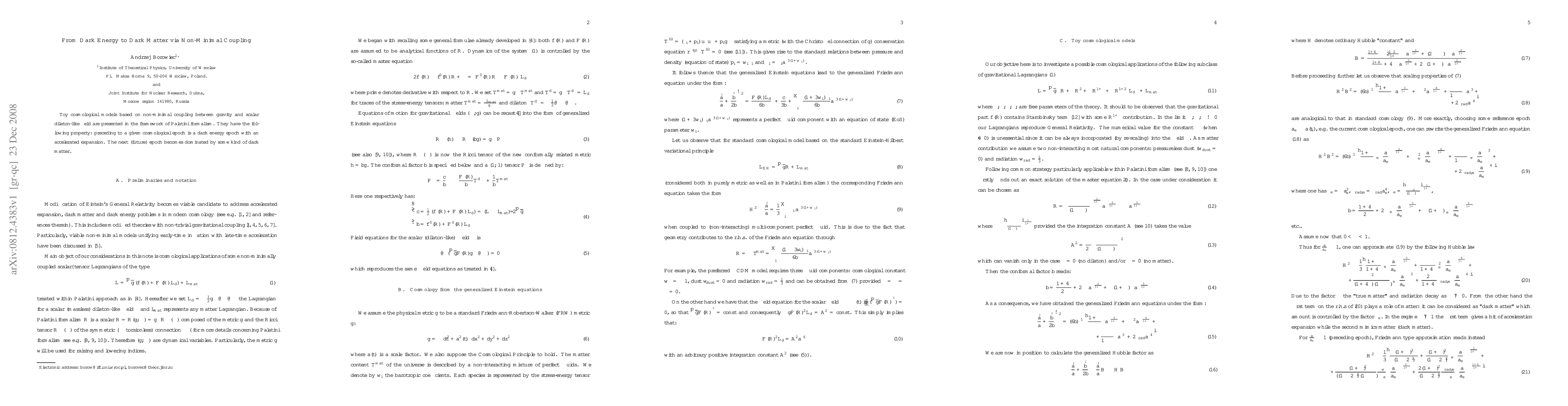 Toy cosmological models based on non-minimal coupling between gravity and scalar dilaton-like field are presented in the framework of Palatini formalism. They have the following property: preceding to a given cosmological epoch is a dark energy epoch with an accelerated expansion. The next (future) epoch becomes dominated by some kind of dark matter.