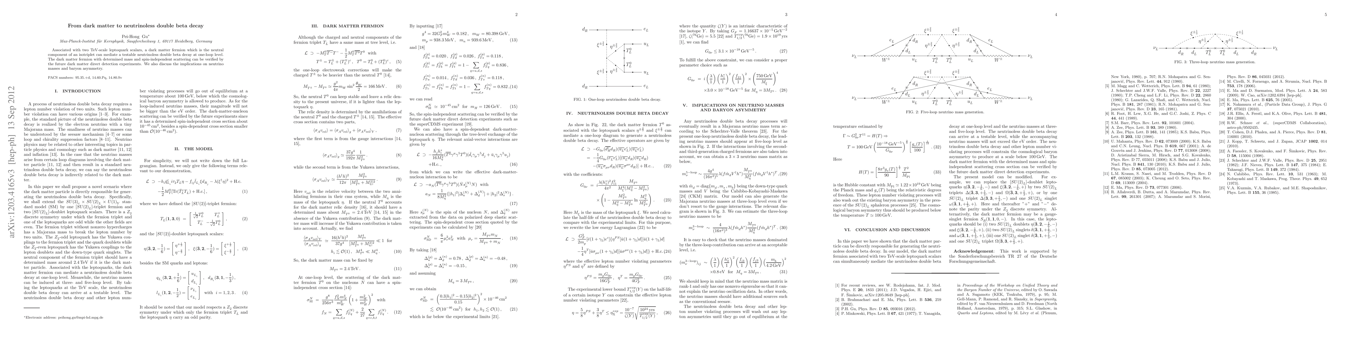 Associated with two TeV-scale leptoquark scalars, a dark matter fermion which is the neutral component of an isotriplet can mediate a testable neutrinoless double beta decay at one-loop level. The dark matter fermion with determined mass and spin-independent scattering can be verified by the future dark matter direct detection experiments. We also discuss the implications on neutrino masses and baryon asymmetry.
