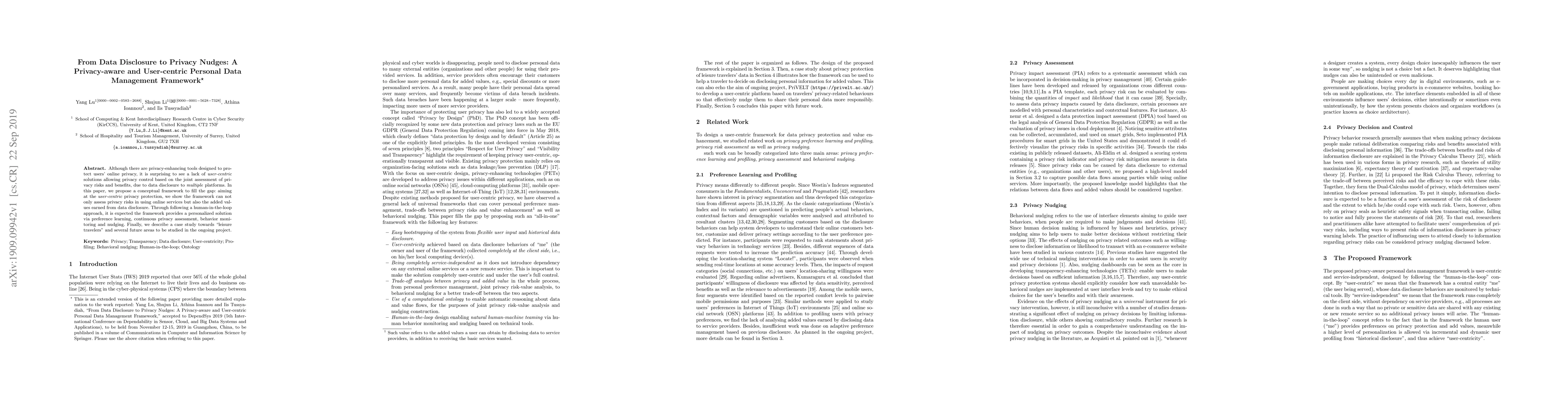 This paper proposes a user-centric personal data management framework that assesses both privacy risks and benefits of data disclosure across multiple platforms. The framework aims to provide personalized privacy solutions through preference learning, continuous assessment, and privacy nudging.