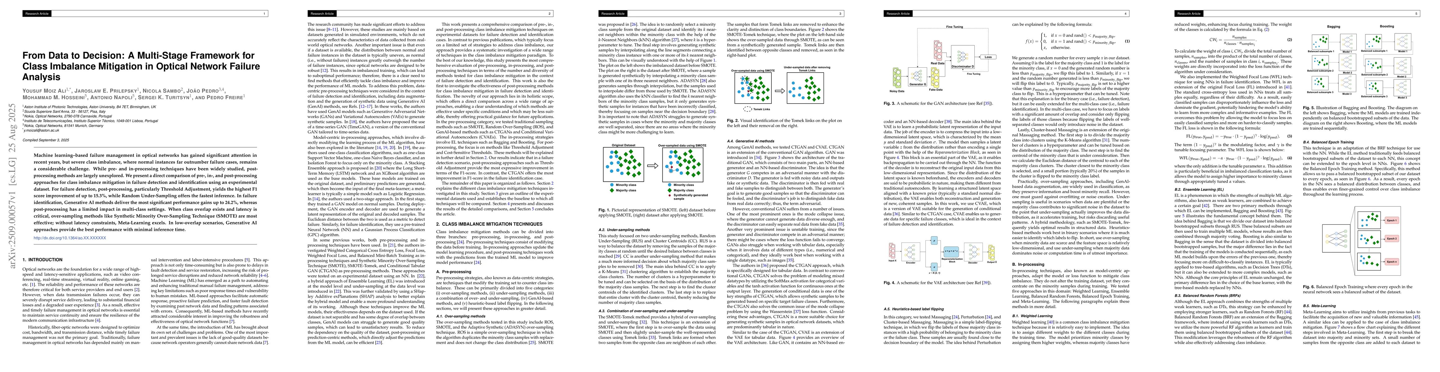 Machine learning-based failure management in optical networks has gained significant attention in recent years. However, severe class imbalance, where normal instances vastly outnumber failure cases, remains a considerable challenge. While pre- and in-processing techniques have been widely studied, post-processing methods are largely unexplored. In this work, we present a direct comparison of pre-, in-, and post-processing approaches for class imbalance mitigation in failure detection and identification using an experimental dataset. For failure detection, post-processing methods-particularly Threshold Adjustment-achieve the highest F1 score improvement (up to 15.3%), while Random Under-Sampling provides the fastest inference. In failure identification, GenAI methods deliver the most substantial performance gains (up to 24.2%), whereas post-processing shows limited impact in multi-class settings. When class overlap is present and latency is critical, over-sampling methods such as the SMOTE are most effective; without latency constraints, Meta-Learning yields the best results. In low-overlap scenarios, Generative AI approaches provide the highest performance with minimal inference time.