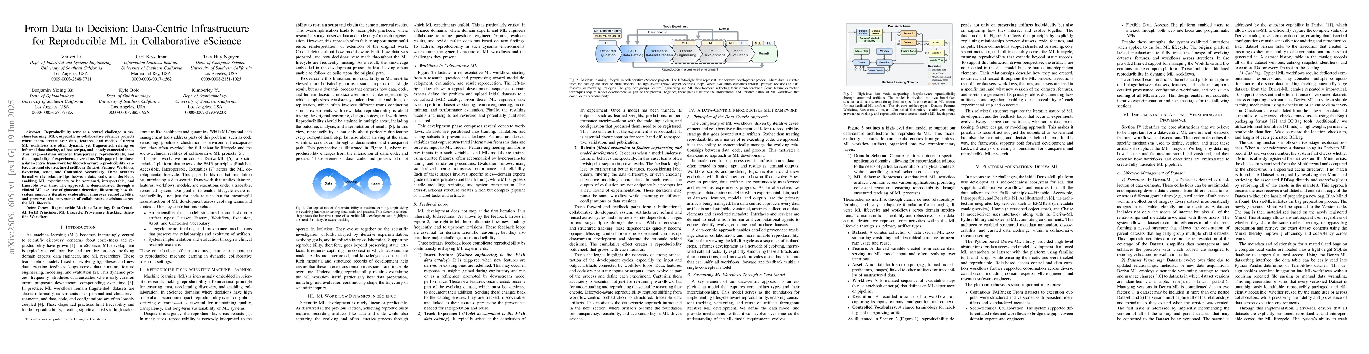 Reproducibility remains a central challenge in machine learning (ML), especially in collaborative eScience projects where teams iterate over data, features, and models. Current ML workflows are often dynamic yet fragmented, relying on informal data sharing, ad hoc scripts, and loosely connected tools. This fragmentation impedes transparency, reproducibility, and the adaptability of experiments over time. This paper introduces a data-centric framework for lifecycle-aware reproducibility, centered around six structured artifacts: Dataset, Feature, Workflow, Execution, Asset, and Controlled Vocabulary. These artifacts formalize the relationships between data, code, and decisions, enabling ML experiments to be versioned, interpretable, and traceable over time. The approach is demonstrated through a clinical ML use case of glaucoma detection, illustrating how the system supports iterative exploration, improves reproducibility, and preserves the provenance of collaborative decisions across the ML lifecycle.