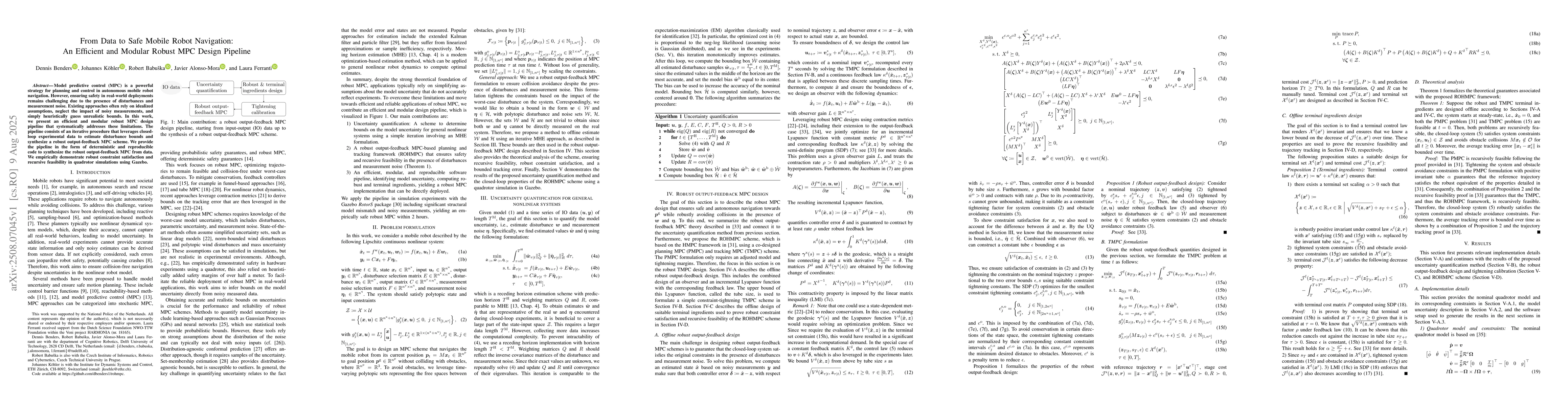 The research presents an efficient and modular robust MPC design pipeline for autonomous mobile robot navigation, addressing safety challenges through closed-loop experimental data to estimate disturbance bounds and synthesize a robust output-feedback MPC scheme.