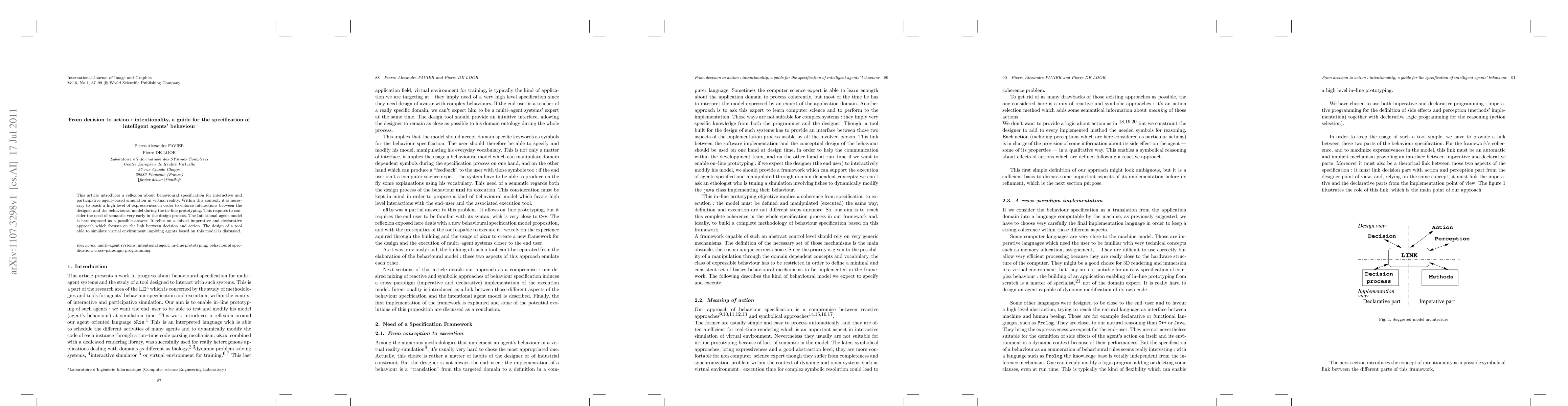 This article introduces a reflexion about behavioural specification for interactive and participative agent-based simulation in virtual reality. Within this context, it is neces sary to reach a high level of expressivness in order to enforce interactions between the designer and the behavioural model during the in-line prototyping. This requires to consider the need of semantic very early in the design process. The Intentional agent model is here exposed as a possible answer. It relies on a mixed imperative and declarative approach which focuses on the link between decision and action. The design of a tool able to simulate virtual environment implying agents based on this model is discuss