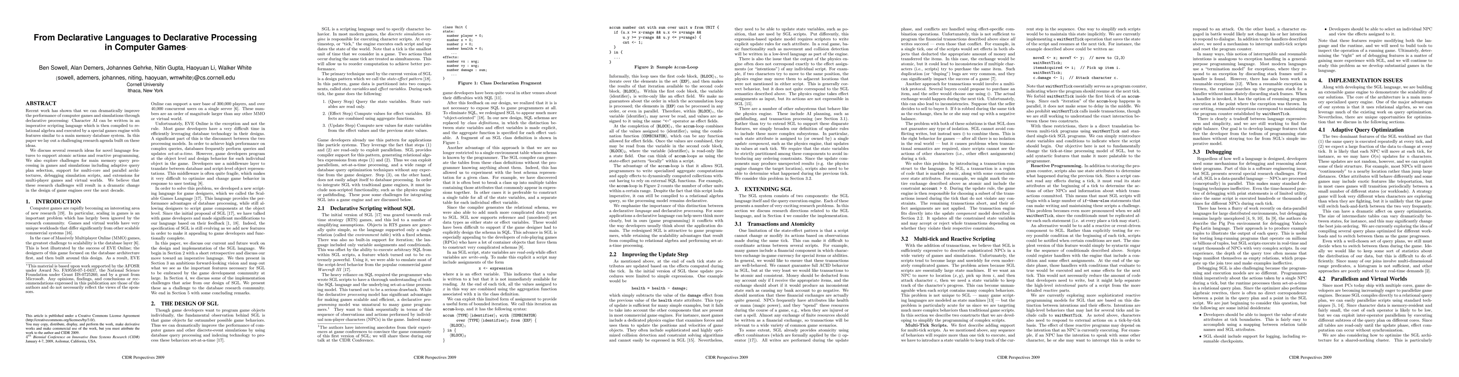 This paper proposes a shift in game engine design using declarative processing, compiling imperative scripts into relational algebra for execution in a game engine akin to a main memory database system. It outlines research challenges including novel language features for atomic actions and reactive programming, adaptive query plan selection, parallel architecture support, debugging, and extensions for multiplayer games and virtual worlds, anticipating significant changes in game engine design over the next decade.