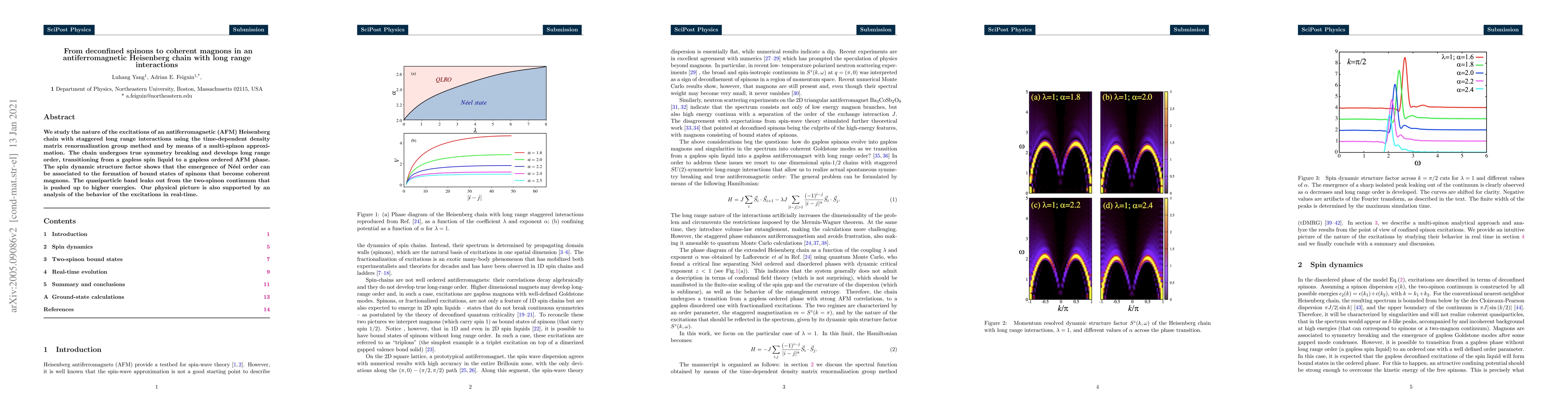 We study the spectrum and the nature of the excitations of an antiferromagnetic (AFM) Heisenberg chain with staggered long range interactions, both numerically using the time-dependent density matrix renormalization group (tDMRG) method and by means of a multi-spinon approximation that qualitatively explains its main features. The unfrustrated long-range nature of the exchange effectively increases the dimensionality of the system and the chain is able to undergo true symmetry breaking and develop long range order, transitioning from a gapless spin liquid to a gapless ordered AFM phase. We calculated the momentum resolved spin dynamical structure factor and found that for weakly decaying interactions the emergence of N\'eel order can be associated to the formation of bound states of spinons that become coherent magnons. The quasiparticle band leaks out from the two-spinon continuum that is pushed up to higher energies. Our physical picture is also supported by an analysis of the behavior of the excitations in real-time.