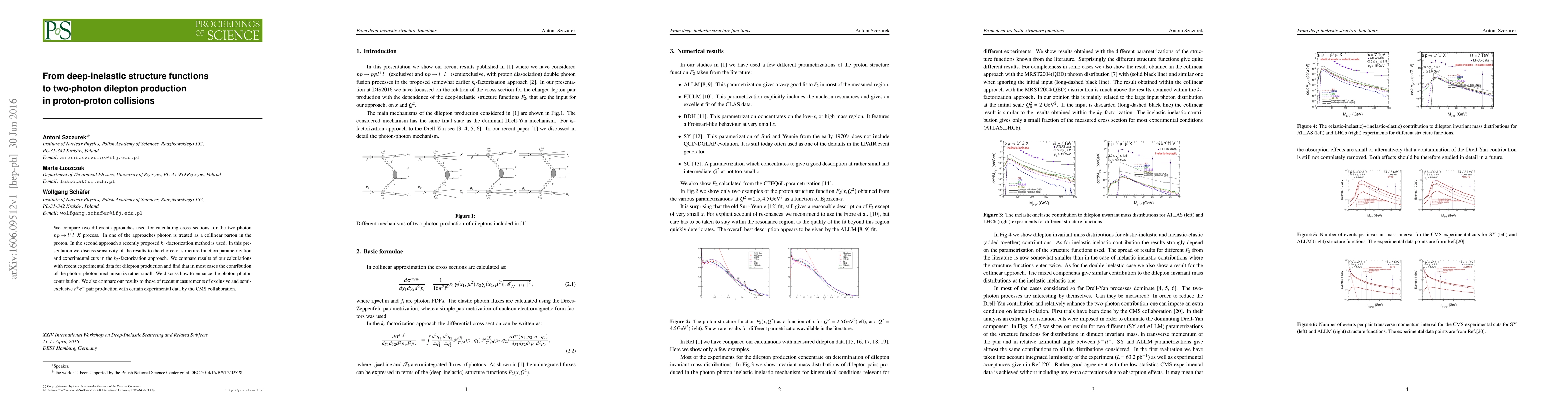 We compare two different approaches used for calculating cross sections for the two-photon $p p \to l^+ l^- X$ process. In one of the approaches photon is treated as a collinear parton in the proton. In the second approach a recently proposed $k_T$-factorization method is used. In this presentation we discuss sensitivity of the results to the choice of structure function parametrization and experimental cuts in the $k_T$-factorization approach. We compare results of our calculations with recent experimental data for dilepton production and find that in most cases the contribution of the photon-photon mechanism is rather small. We discuss how to enhance the photon-photon contribution. We also compare our results to those of recent measurements of exclusive and semi-exclusive $e^+ e^-$ pair production with certain experimental data by the CMS collaboration.