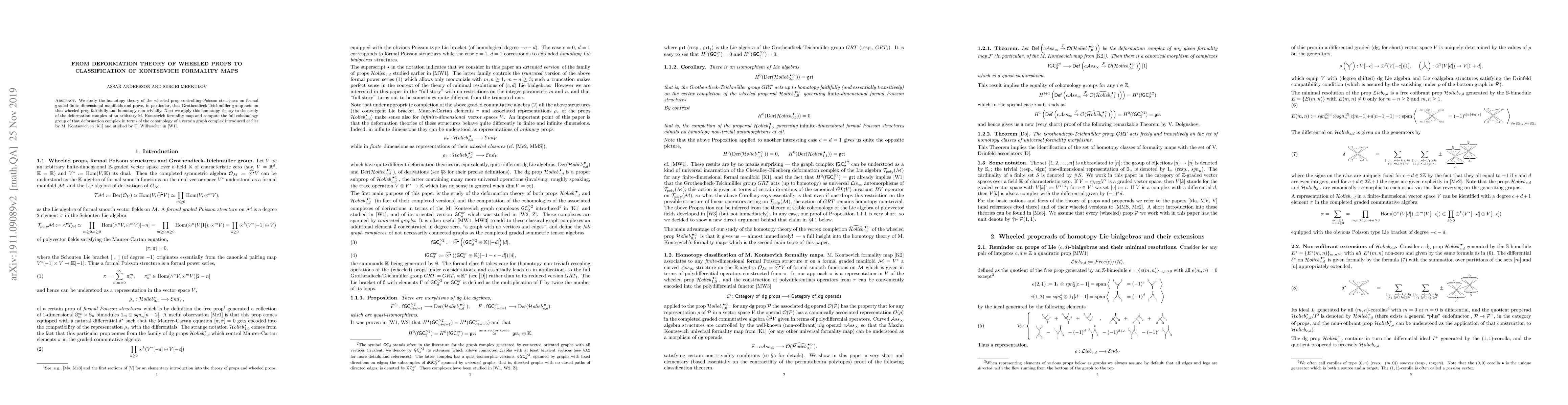 This paper investigates the homotopy theory of a wheeled prop for Poisson structures on formal manifolds, proving the Grothendieck-Teichmueller group's faithful and non-trivial action. It further applies this to classify Kontsevich formality maps by computing the cohomology of their deformation complex via a graph complex.