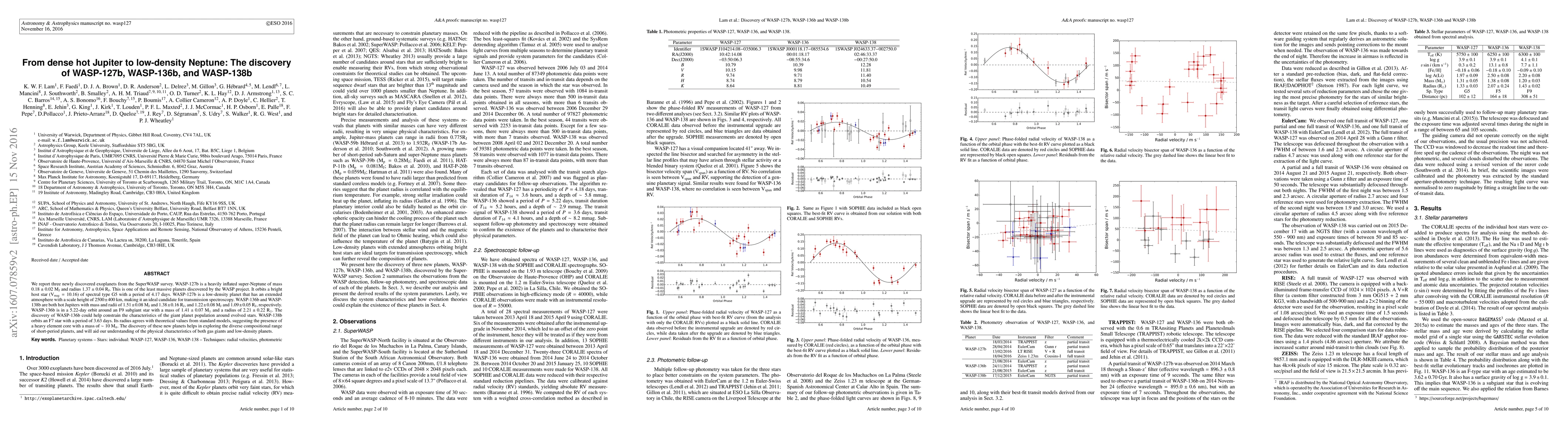 The paper reports the discovery of three new exoplanets: WASP-127b, a low-density super-Neptune with an extended atmosphere; and WASP-136b and WASP-138b, both hot Jupiters, expanding the understanding of the compositional range of short-period planets.