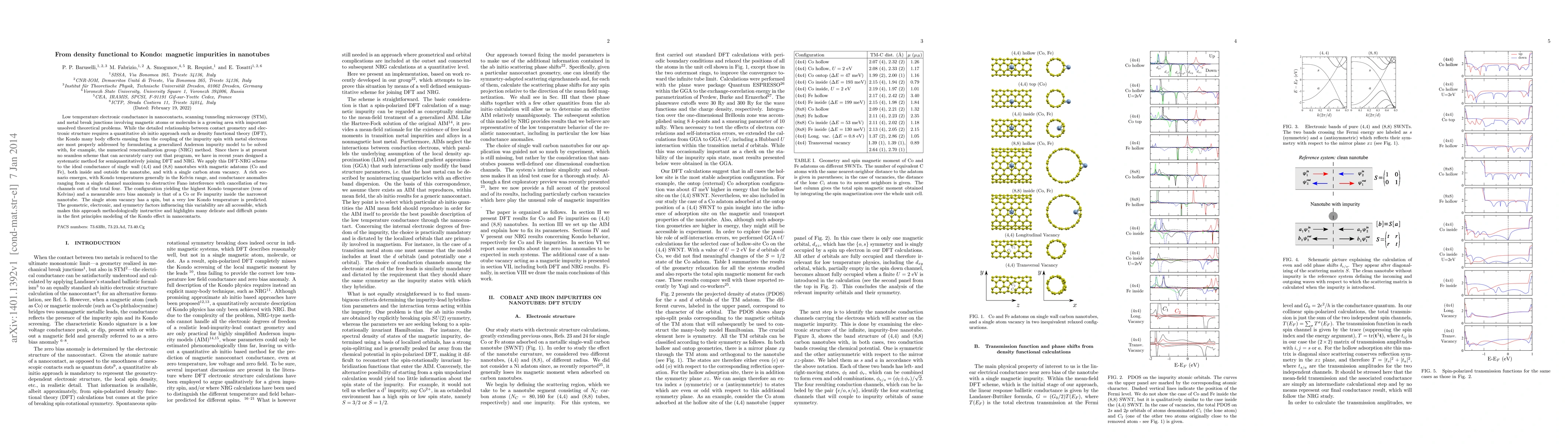 Low-temperature electronic conductance in nanocontacts, scanning tunneling microscopy (STM), and metal break junctions involving magnetic atoms or molecules is a growing area with important unsolved theoretical problems. While the detailed relationship between contact geometry and electronic structure requires a quantitative ab initio approach such as density functional theory (DFT), the Kondo many-body effects ensuing from the coupling of the impurity spin with metal electrons are most properly addressed by formulating a generalized Anderson impurity model to be solved with, for example, the numerical renormalization group (NRG) method. Since there is at present no seamless scheme that can accurately carry out that program, we have in recent years designed a systematic method for semiquantitatively joining DFT and NRG. We apply this DFT-NRG scheme to the ideal conductance of single wall (4,4) and (8,8) nanotubes with magnetic adatoms (Co and Fe), both inside and outside the nanotube, and with a single carbon atom vacancy. A rich scenario emerges, with Kondo temperatures generally in the Kelvin range, and conductance anomalies ranging from a single channel maximum to destructive Fano interference with cancellation of two channels out of the total four. The configuration yielding the highest Kondo temperature (tens of Kelvins) and a measurable zero-bias anomaly is that of a Co or Fe impurity inside the narrowest nanotube. The single atom vacancy has a spin, but a very low Kondo temperature is predicted. The geometric, electronic, and symmetry factors influencing this variability are all accessible, which makes this approach methodologically instructive and highlights many delicate and difficult points in the first-principles modeling of the Kondo effect in nanocontacts.