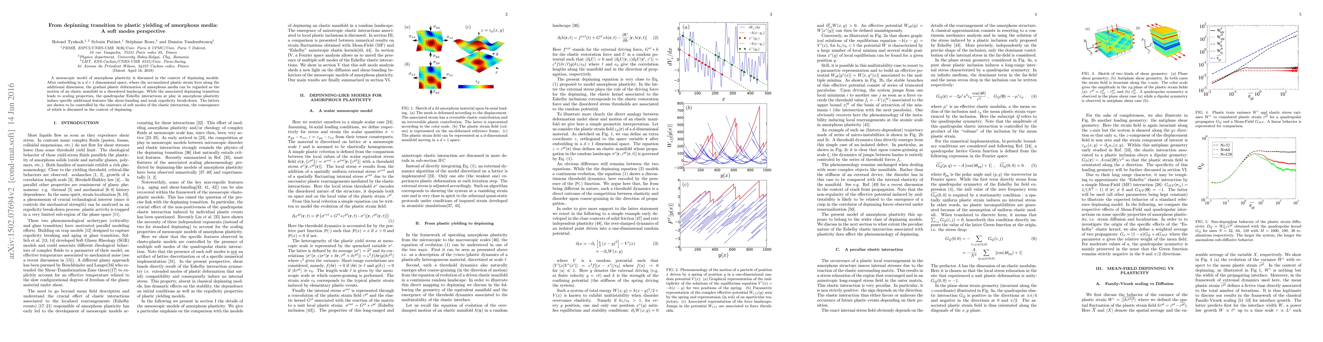 This paper explores a mesoscopic model of amorphous plasticity framed within depinning transitions, showing how gradual plastic deformation can be viewed as elastic manifold motion in a disordered landscape. It highlights the unique features of shear-banding and weak ergodicity breakdown in amorphous media, attributed to the presence of soft modes in elastic interactions.