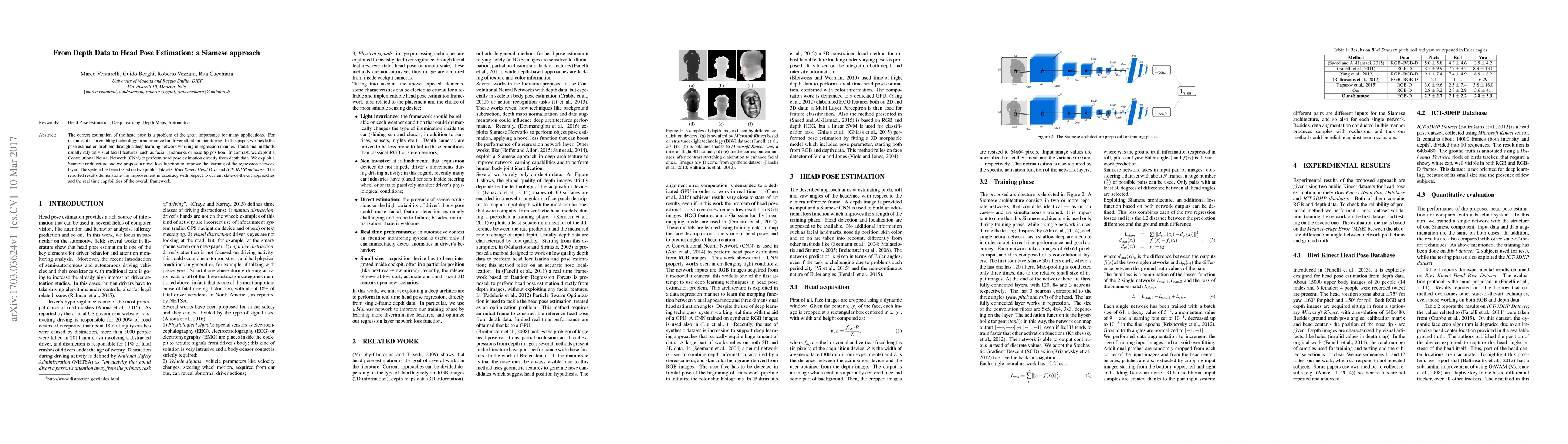 This paper proposes a deep learning-based Siamese network for head pose estimation directly from depth data, improving accuracy over traditional methods reliant on facial landmarks. The novel loss function enhances regression learning, achieving better results on Biwi Kinect and ICT-3DHP datasets with real-time capabilities.