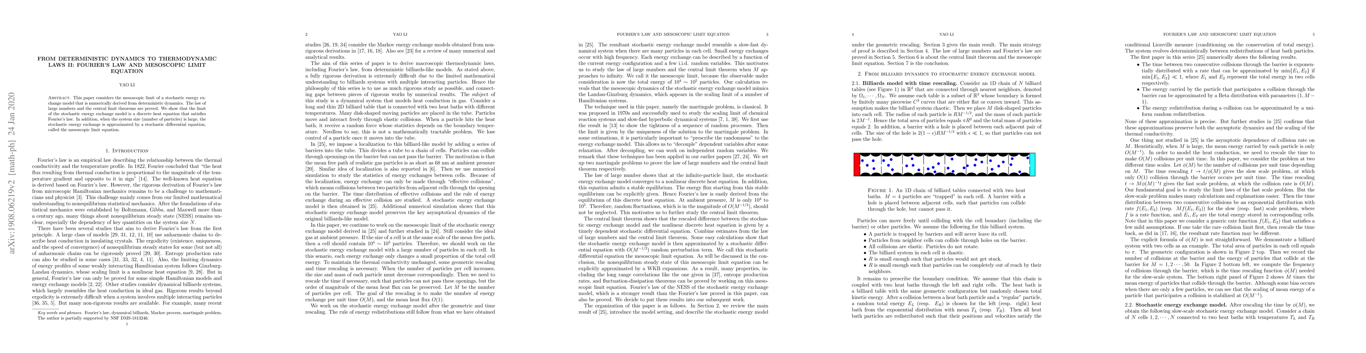 This paper derives the mesoscopic limit of a stochastic energy exchange model from deterministic dynamics, proving the law of large numbers and central limit theorems. It shows that this limit results in a discrete heat equation adhering to Fourier's law and introduces a mesoscopic limit equation for large systems.