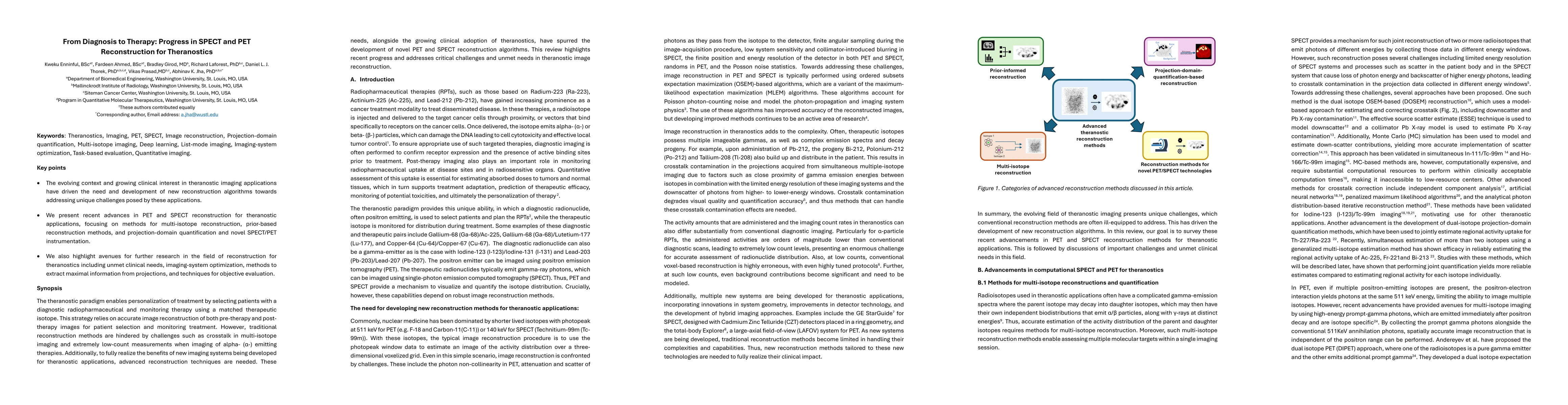 The theranostic paradigm enables personalization of treatment by selecting patients with a diagnostic radiopharmaceutical and monitoring therapy using a matched therapeutic isotope. This strategy relies on accurate image reconstruction of both pre-therapy and post-therapy images for patient selection and monitoring treatment. However, traditional reconstruction methods are hindered by challenges such as crosstalk in multi-isotope imaging and extremely low-count measurements when imaging of alpha- ({\alpha}-) emitting therapies. Additionally, to fully realize the benefits of new imaging systems being developed for theranostic applications, advanced reconstruction techniques are needed. These needs, alongside the growing clinical adoption of theranostics, have spurred the development of novel PET and SPECT reconstruction algorithms. This review highlights recent progress and addresses critical challenges and unmet needs in theranostic image reconstruction.