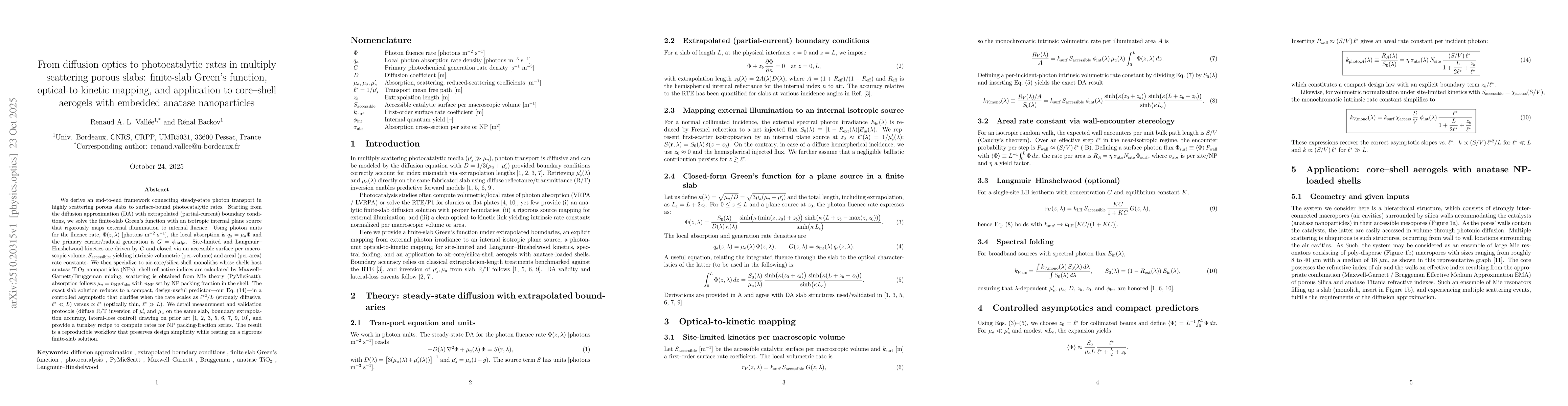 First to combine finite-slab diffusion solutions with explicit boundary normalization and photon-unit kinetics for photocatalytic rate prediction in multiply scattering porous slabs