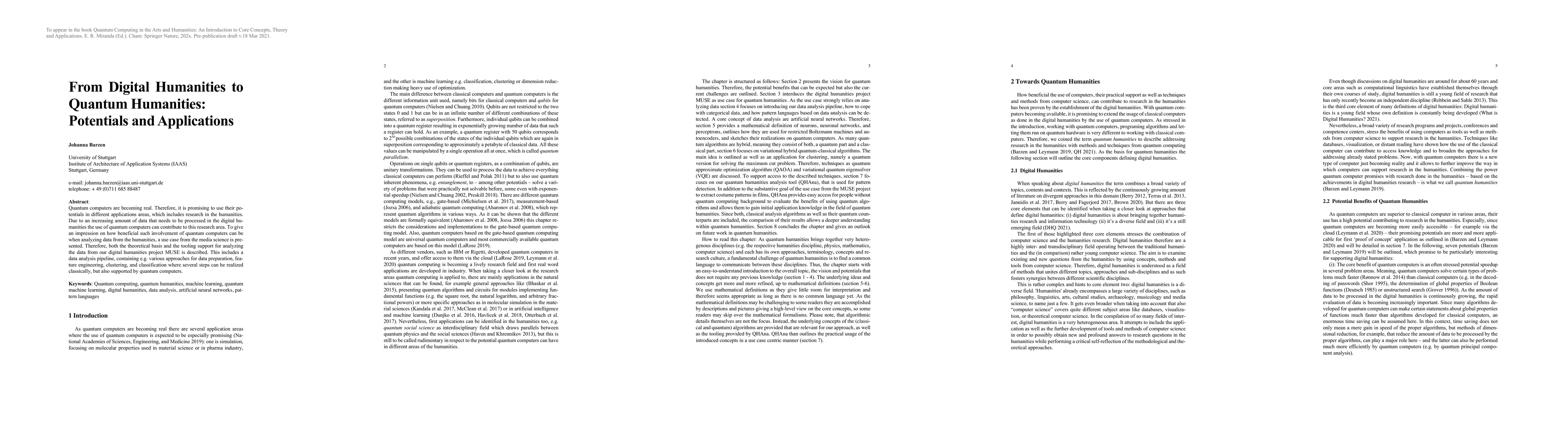 This paper explores the potential applications of quantum computing in the digital humanities, particularly in handling large datasets. It presents a use case from media science and describes a data analysis pipeline for the MUSE project, highlighting both classical and quantum-enhanced data processing methods.