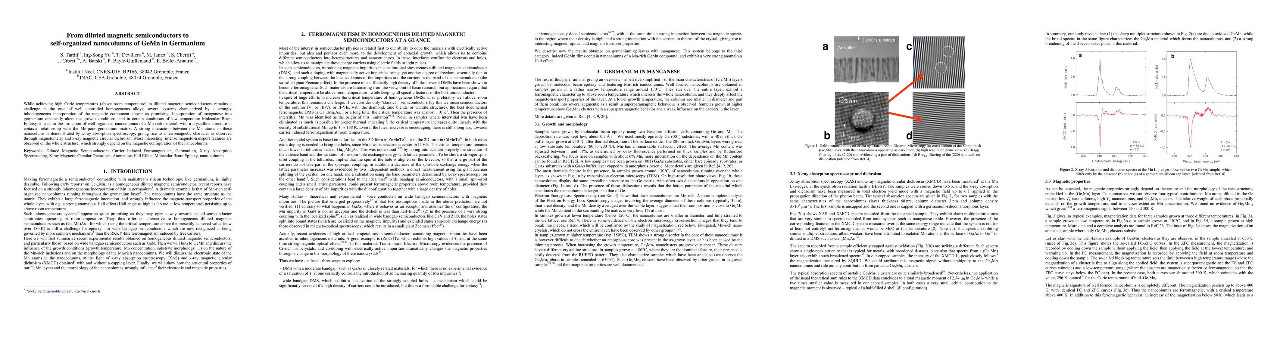 While achieving high Curie temperatures (above room temperature) in diluted magnetic semiconductors remains a challenge in the case of well controlled homogeneous alloys, several systems characterized by a strongly inhomogeneous incorporation of the magnetic component appear as promising. Incorporation of manganese into germanium drastically alters the growth conditions, and in certain conditions of low temperature Molecular Beam Epitaxy it leads to the formation of well organized nanocolumns of a Mn-rich material, with a crystalline structure in epitaxial relationship with the Mn-poor germanium matrix. A strong interaction between the Mn atoms in these nanocolums is demonstrated by x-ray absorption spectroscopy, giving rise to a ferromagnetic character as observed through magnetometry and x-ray magnetic circular dichroism. Most interesting, intense magneto-transport features are observed on the whole structure, which strongly depend on the magnetic configuration of the nanocolumns.