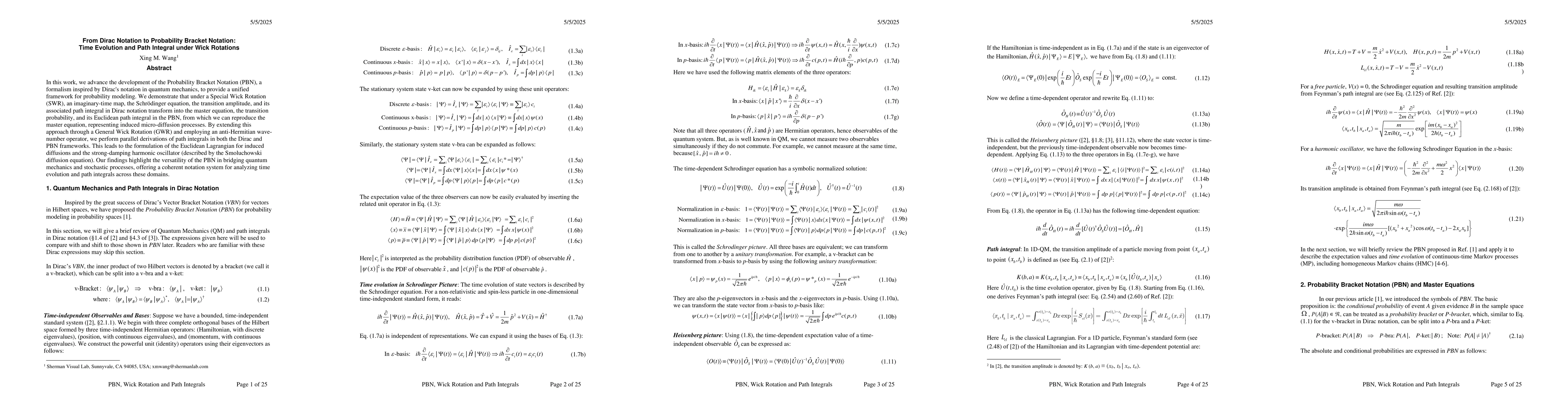 This paper explores the transition from Dirac notation to Probability Bracket Notation (PBN) under Wick rotations, demonstrating how the Schrödinger equation and its path integral transform into the master equation and Euclidean path integral of induced micro diffusion in PBN. It further extends this to General Wick Rotation, deriving the Euclidean Lagrangian and Smoluchowski equation.