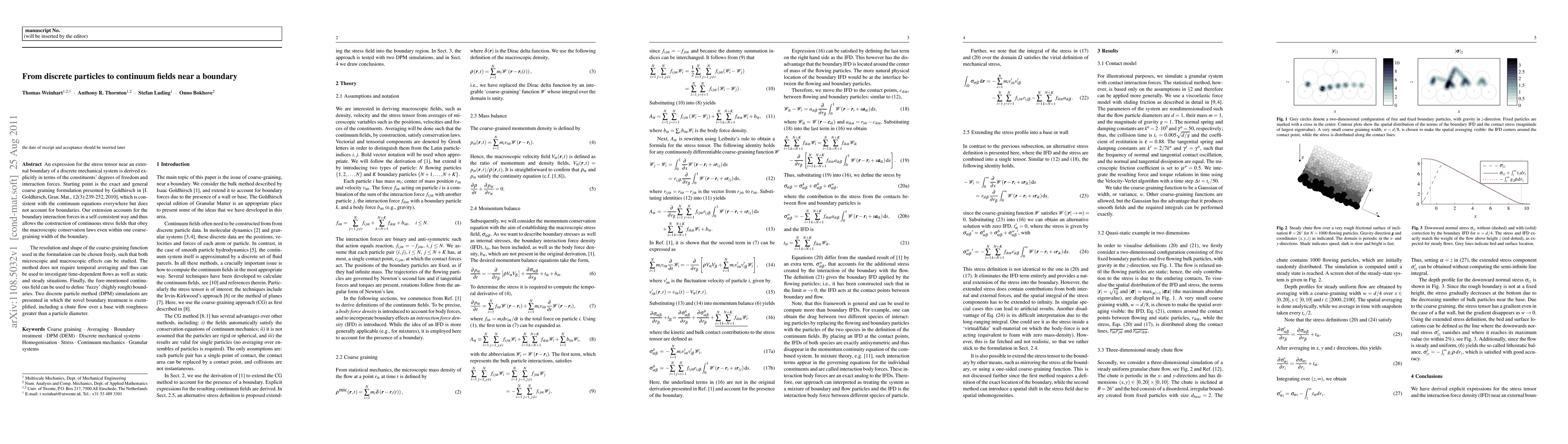 An expression for the stress tensor near an external boundary of a discrete mechanical system is derived explicitly in terms of the constituents' degrees of freedom and interaction forces. Starting point is the exact and general coarse graining formulation presented by Goldhirsch in [I. Goldhirsch, Gran. Mat., 12(3):239-252, 2010], which is consistent with the continuum equations everywhere but does not account for boundaries. Our extension accounts for the boundary interaction forces in a self-consistent way and thus allows the construction of continuous stress fields that obey the macroscopic conservation laws even within one coarse-graining width of the boundary. The resolution and shape of the coarse-graining function used in the formulation can be chosen freely, such that both microscopic and macroscopic effects can be studied. The method does not require temporal averaging and thus can be used to investigate time-dependent flows as well as static and steady situations. Finally, the fore-mentioned continuous field can be used to define 'fuzzy' (highly rough) boundaries. Two discrete particle method simulations are presented in which the novel boundary treatment is exemplified, including a chute flow over a base with roughness greater than a particle diameter.