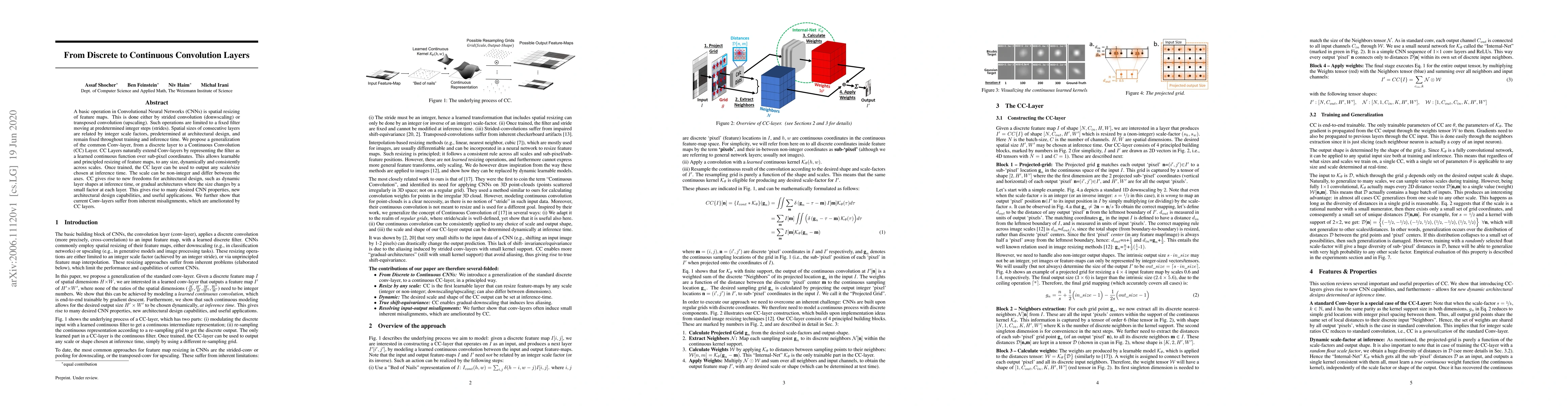 A basic operation in Convolutional Neural Networks (CNNs) is spatial resizing of feature maps. This is done either by strided convolution (donwscaling) or transposed convolution (upscaling). Such operations are limited to a fixed filter moving at predetermined integer steps (strides). Spatial sizes of consecutive layers are related by integer scale factors, predetermined at architectural design, and remain fixed throughout training and inference time. We propose a generalization of the common Conv-layer, from a discrete layer to a Continuous Convolution (CC) Layer. CC Layers naturally extend Conv-layers by representing the filter as a learned continuous function over sub-pixel coordinates. This allows learnable and principled resizing of feature maps, to any size, dynamically and consistently across scales. Once trained, the CC layer can be used to output any scale/size chosen at inference time. The scale can be non-integer and differ between the axes. CC gives rise to new freedoms for architectural design, such as dynamic layer shapes at inference time, or gradual architectures where the size changes by a small factor at each layer. This gives rise to many desired CNN properties, new architectural design capabilities, and useful applications. We further show that current Conv-layers suffer from inherent misalignments, which are ameliorated by CC layers.