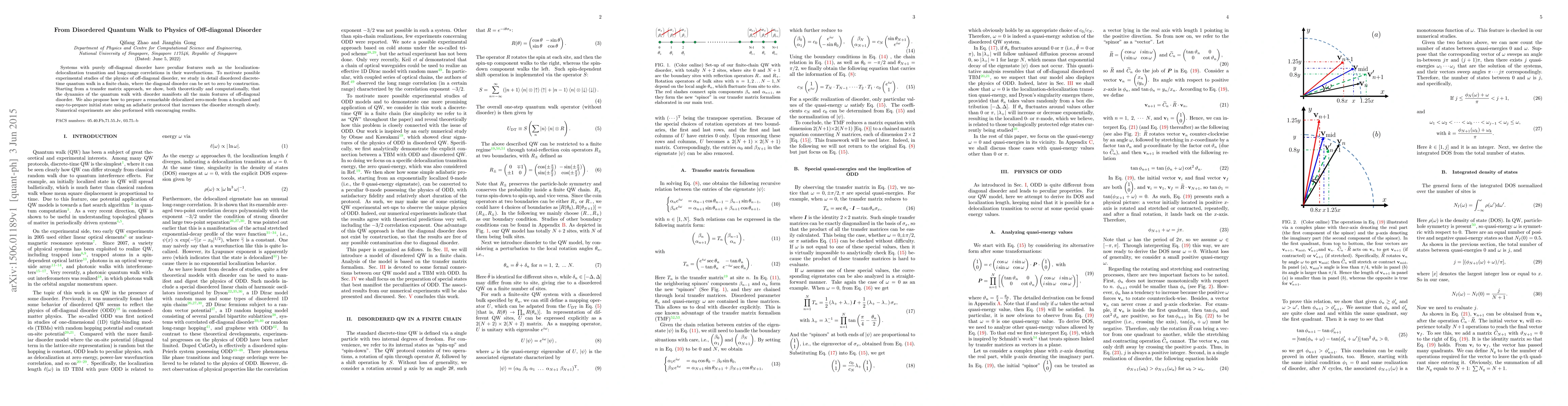 This paper explores the dynamics of a disordered quantum walk in a finite chain, demonstrating the main features of off-diagonal disorder, including localization-delocalization transitions and long-range correlations. It proposes an adiabatic protocol to prepare a delocalized zero-mode from a localized initial state and supports the findings with numerical experiments.