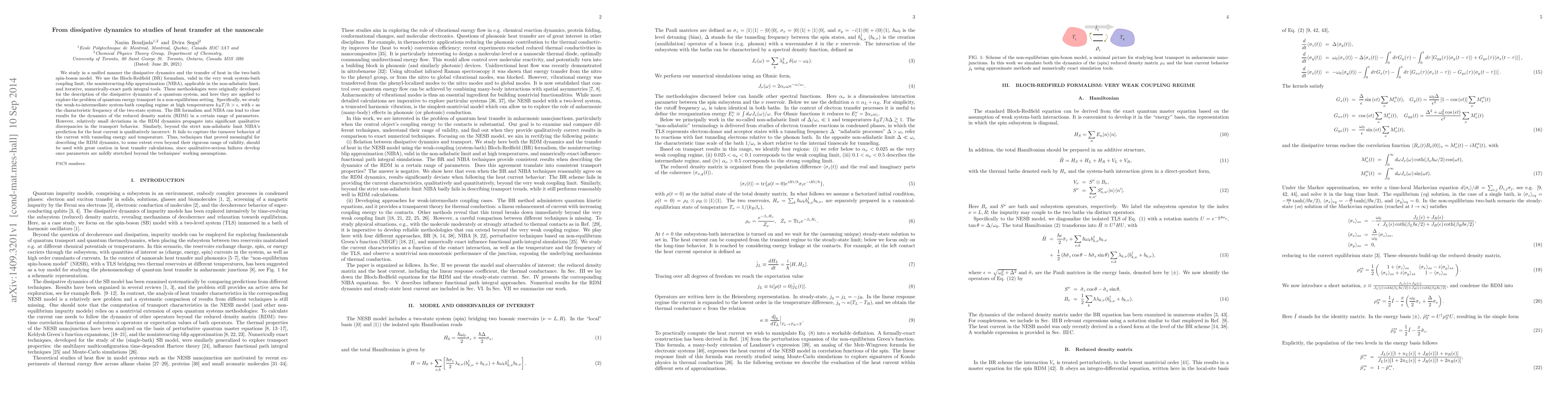 We study in a unified manner the dissipative dynamics and the transfer of heat in the two-bath spin-boson model. We use the Bloch-Redfield (BR) formalism, valid in the very weak system-bath coupling limit, the noninteracting-blip approximation (NIBA), applicable in the non-adiabatic limit, and iterative, numerically-exact path integral tools. These methodologies were originally developed for the description of the dissipative dynamics of a quantum system, and here they are applied to explore the problem of quantum energy transport in a non-equilibrium setting. Specifically, we study the weak-to-intermediate system-bath coupling regime at high temperatures $k_BT/\hbar>\epsilon$, with $\epsilon$ as the characteristic frequency of the two-state system. The BR formalism and NIBA can lead to close results for the dynamics of the reduced density matrix (RDM) in a certain range of parameters. However, relatively small deviations in the RDM dynamics propagate into significant qualitative discrepancies in the transport behavior. Similarly, beyond the strict non-adiabatic limit NIBA's prediction for the heat current is qualitatively incorrect: It fails to capture the turnover behavior of the current with tunneling energy and temperature. Thus, techniques that proved meaningful for describing the RDM dynamics, to some extent even beyond their rigorous range of validity, should be used with great caution in heat transfer calculations, since qualitative-serious failures develop once parameters are mildly stretched beyond the techniques' working assumptions.