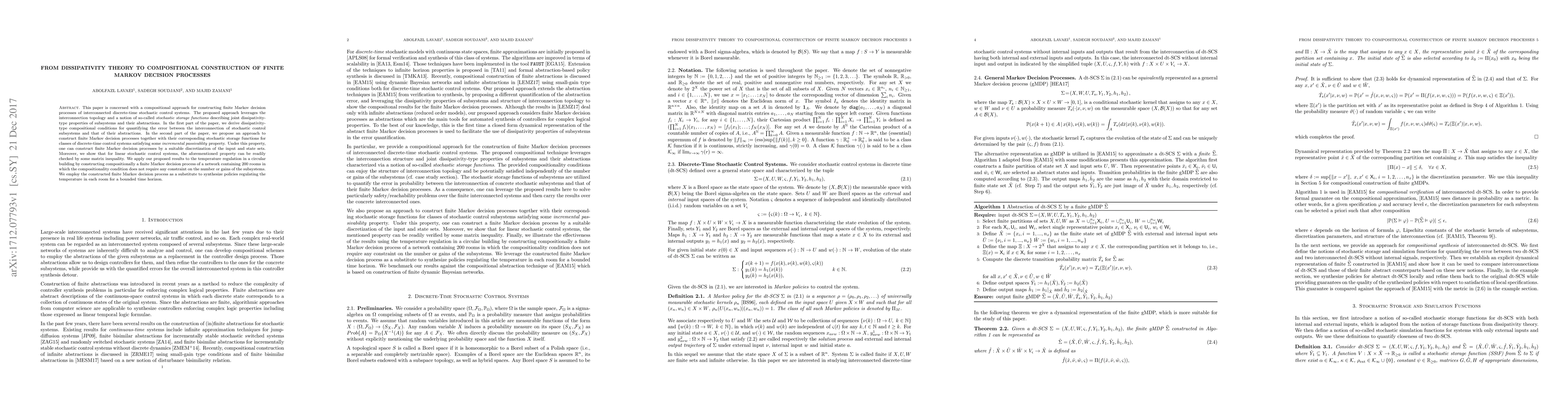 This paper presents a compositional method for constructing finite Markov decision processes for interconnected discrete-time stochastic control systems, utilizing dissipativity theory and stochastic storage functions. It also demonstrates the approach through a temperature regulation problem in a large network of rooms.