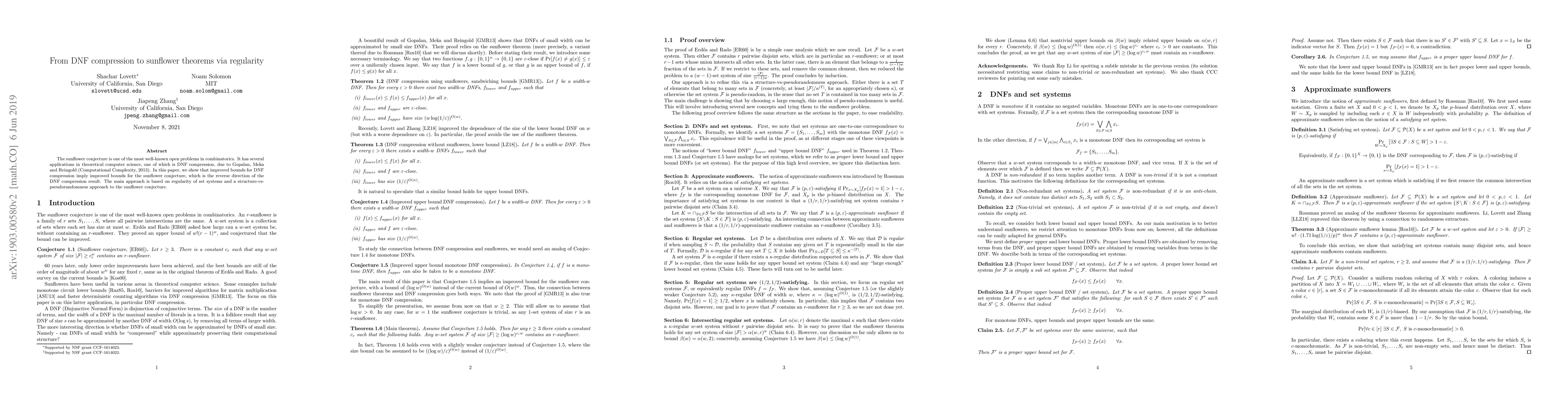 This paper establishes a connection between DNF compression and the sunflower conjecture, showing that improved bounds for one imply improved bounds for the other using a regularity approach.