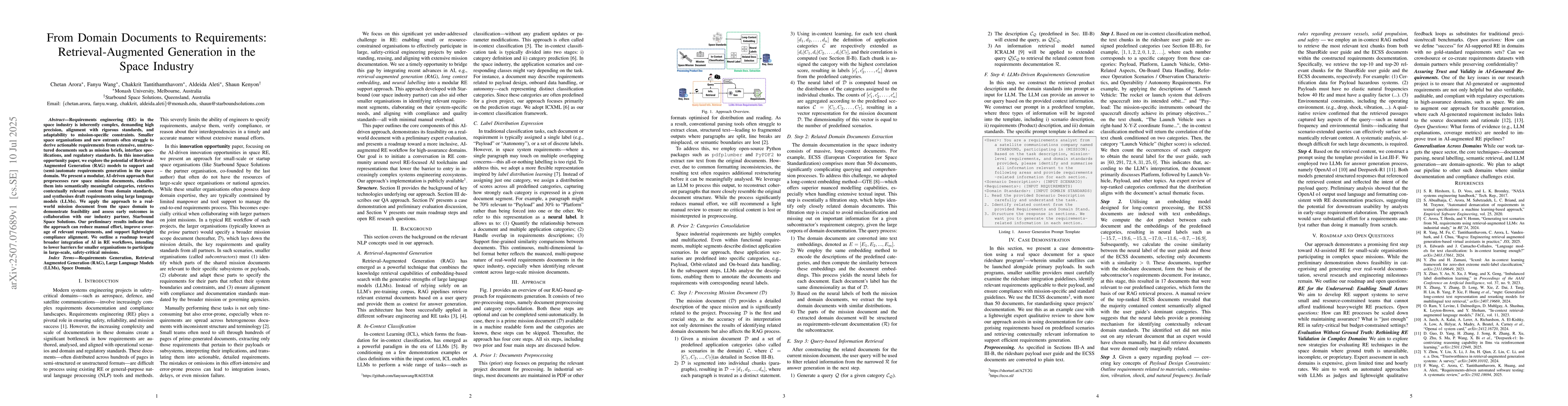 Requirements engineering (RE) in the space industry is inherently complex, demanding high precision, alignment with rigorous standards, and adaptability to mission-specific constraints. Smaller space organisations and new entrants often struggle to derive actionable requirements from extensive, unstructured documents such as mission briefs, interface specifications, and regulatory standards. In this innovation opportunity paper, we explore the potential of Retrieval-Augmented Generation (RAG) models to support and (semi-)automate requirements generation in the space domain. We present a modular, AI-driven approach that preprocesses raw space mission documents, classifies them into semantically meaningful categories, retrieves contextually relevant content from domain standards, and synthesises draft requirements using large language models (LLMs). We apply the approach to a real-world mission document from the space domain to demonstrate feasibility and assess early outcomes in collaboration with our industry partner, Starbound Space Solutions. Our preliminary results indicate that the approach can reduce manual effort, improve coverage of relevant requirements, and support lightweight compliance alignment. We outline a roadmap toward broader integration of AI in RE workflows, intending to lower barriers for smaller organisations to participate in large-scale, safety-critical missions.