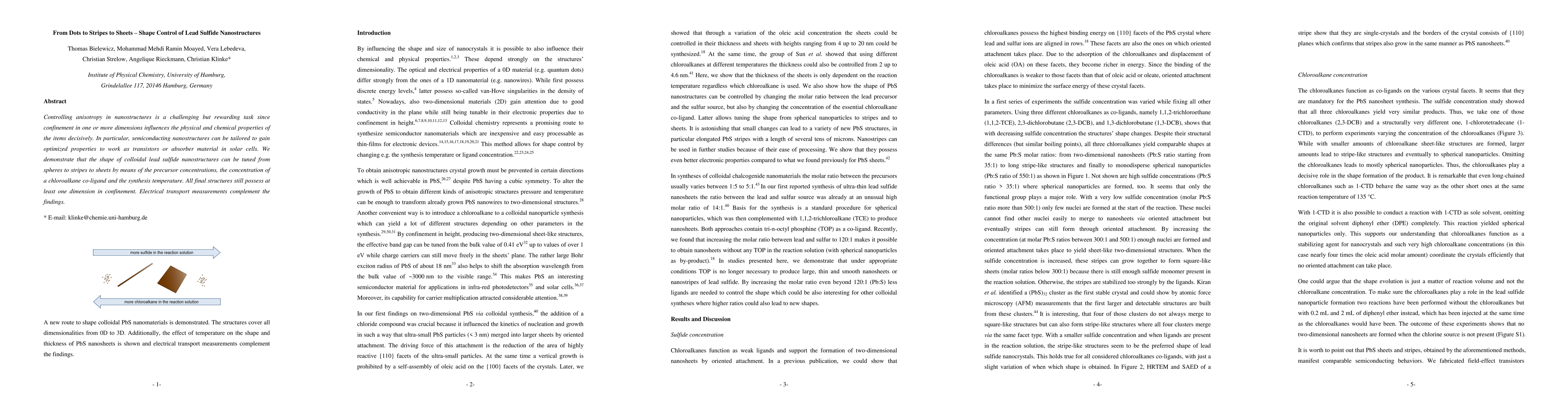 This paper demonstrates how the shape of lead sulfide nanostructures can be controlled from spheres to stripes to sheets through varying precursor concentrations, chloroalkane co-ligand concentration, and synthesis temperature, with all structures maintaining dimensional confinement. Electrical transport measurements support the findings, highlighting the potential for optimizing properties for applications in transistors and solar cells.