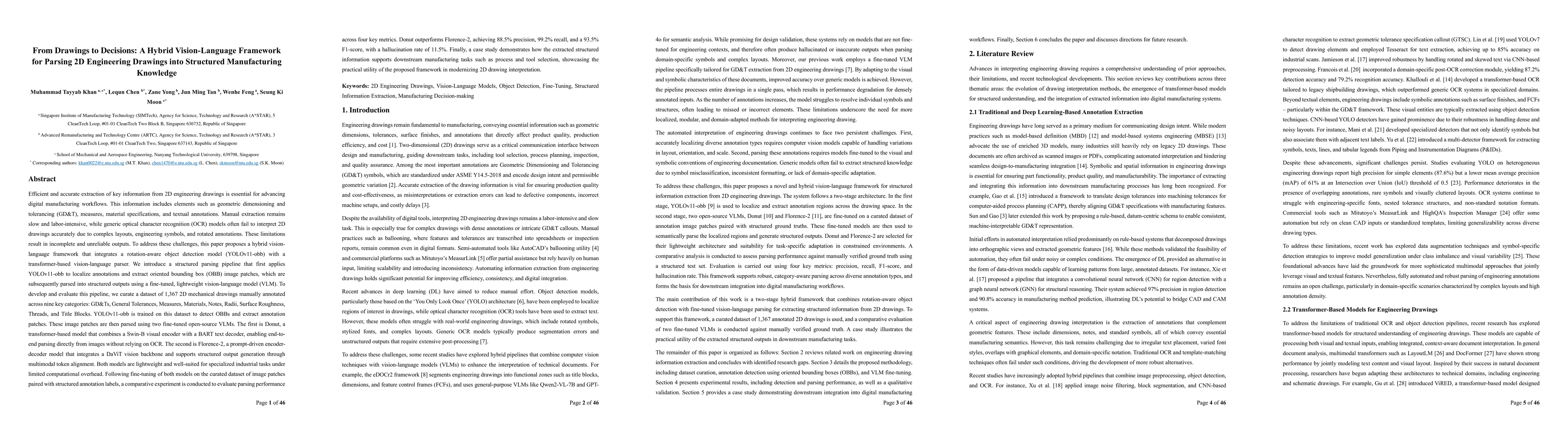 This research introduces a hybrid vision-language framework for accurately extracting structured manufacturing knowledge from 2D engineering drawings. The framework combines a rotation-aware object detection model (YOLOv11-OBB) with a transformer-based vision-language parser. Trained on a dataset of 1,367 mechanical drawings, the system outperforms with Donut VLM achieving high precision, recall, and F1-score. The method demonstrates practical utility in modernizing drawing interpretation for downstream manufacturing tasks.