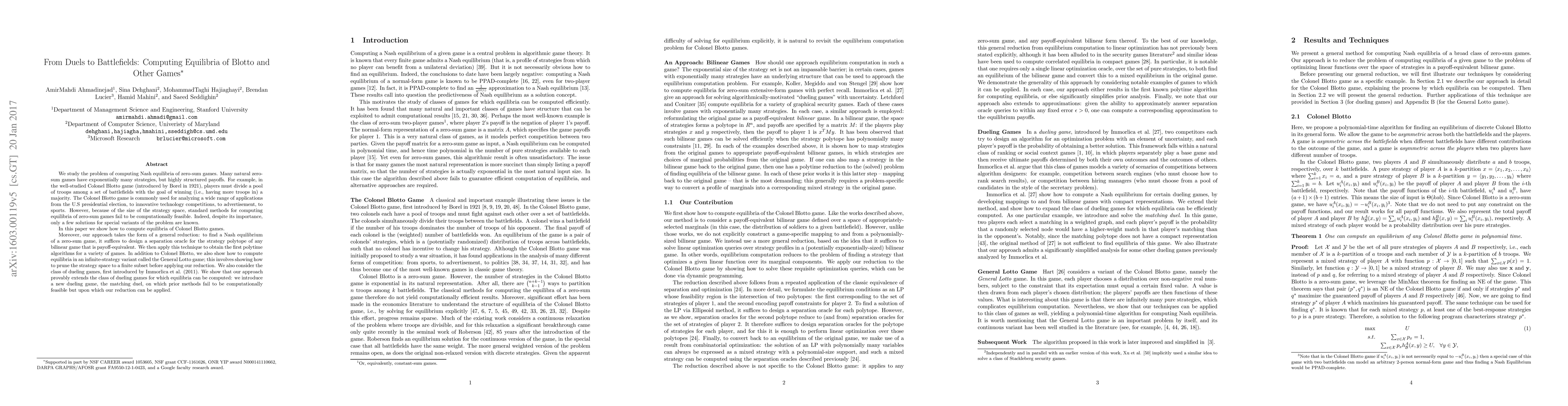 We study the problem of computing Nash equilibria of zero-sum games. Many natural zero-sum games have exponentially many strategies, but highly structured payoffs. For example, in the well-studied Colonel Blotto game (introduced by Borel in 1921), players must divide a pool of troops among a set of battlefields with the goal of winning (i.e., having more troops in) a majority. The Colonel Blotto game is commonly used for analyzing a wide range of applications from the U.S presidential election, to innovative technology competitions, to advertisement, to sports. However, because of the size of the strategy space, standard methods for computing equilibria of zero-sum games fail to be computationally feasible. Indeed, despite its importance, only a few solutions for special variants of the problem are known. In this paper we show how to compute equilibria of Colonel Blotto games. Moreover, our approach takes the form of a general reduction: to find a Nash equilibrium of a zero-sum game, it suffices to design a separation oracle for the strategy polytope of any bilinear game that is payoff-equivalent. We then apply this technique to obtain the first polytime algorithms for a variety of games. In addition to Colonel Blotto, we also show how to compute equilibria in an infinite-strategy variant called the General Lotto game; this involves showing how to prune the strategy space to a finite subset before applying our reduction. We also consider the class of dueling games, first introduced by Immorlica et al. (2011). We show that our approach provably extends the class of dueling games for which equilibria can be computed: we introduce a new dueling game, the matching duel, on which prior methods fail to be computationally feasible but upon which our reduction can be applied.