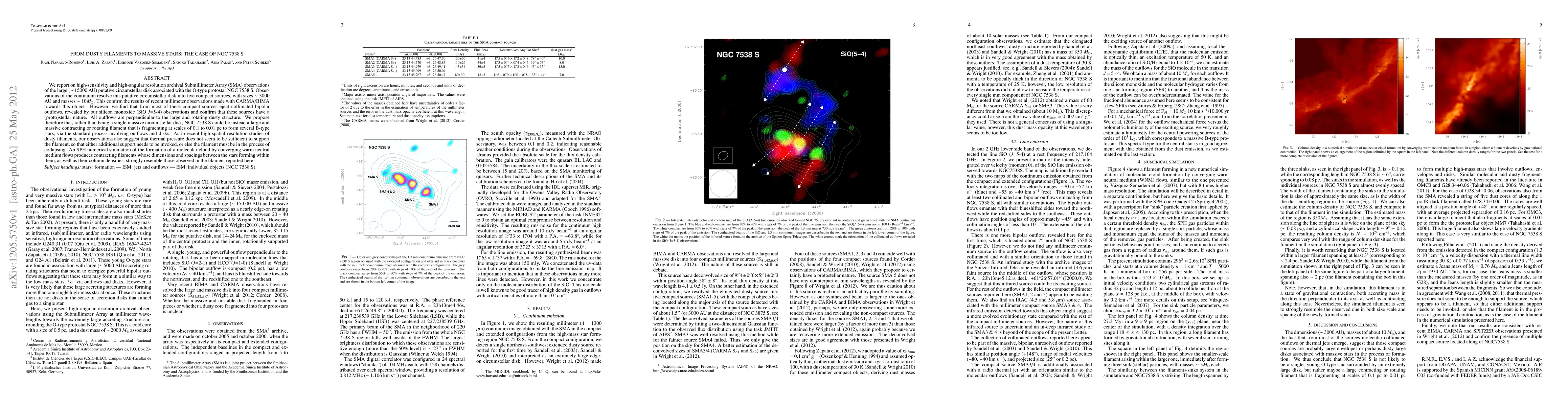 We report on high-sensitivity and high-angular resolution archival Submillimeter Array (SMA) observations of the large ($\sim$15000 AU) putative circumstellar disk associated with the O-type protostar NGC 7538 S. Observations of the continuum resolve this putative circumstellar disk into five compact sources, with sizes $\sim$ 3000 AU and masses $\sim10 M_\odot$. This confirm the results of recent millimeter observations made with CARMA/BIMA towards this object. However, we find that from most of these compact sources eject collimated bipolar outflows, revealed by our silicon monoxide (SiO {\it J}=5-4) observations and confirm that these sources have a (proto)stellar nature. All outflows are perpendicular to the large and rotating dusty structure. We propose therefore that, rather than being a single massive circumstellar disk, NGC 7538 S could be instead a large and massive contracting or rotating filament that is fragmenting at scales of 0.1 to 0.01 pc to form several B-type stars, via the standard process involving outflows and disks. As in recent high spatial resolution studies of dusty filaments, our observations also suggest that thermal pressure does not seem to be sufficient to support the filament, so that either additional support needs to be invoked, or else the filament must be in the process of collapsing. An SPH numerical simulation of the formation of a molecular cloud by converging warm neutral medium flows produces contracting filaments whose dimensions and spacings between the stars forming within them, as well as their column densities, strongly resemble those observed in the filament reported here.