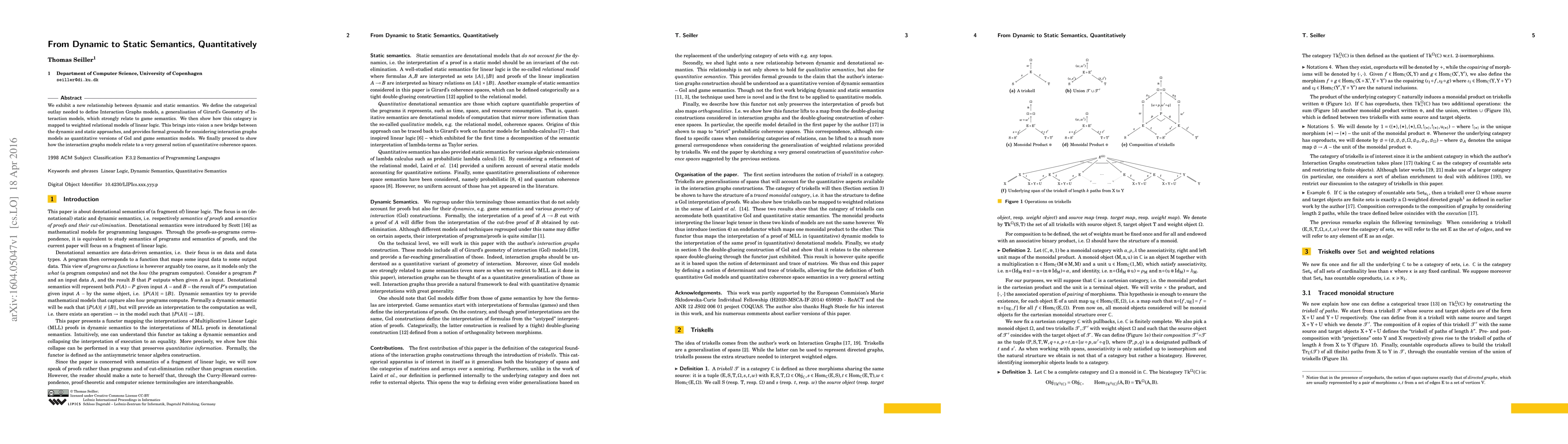 This paper establishes a novel bridge between dynamic and static semantics by defining a categorical framework for Interaction Graphs, generalizing Girard's Geometry of Interaction models, and showing its quantitative mapping to weighted relational models of linear logic, thus providing formal grounds for viewing interaction graphs as quantitative versions of game semantics.