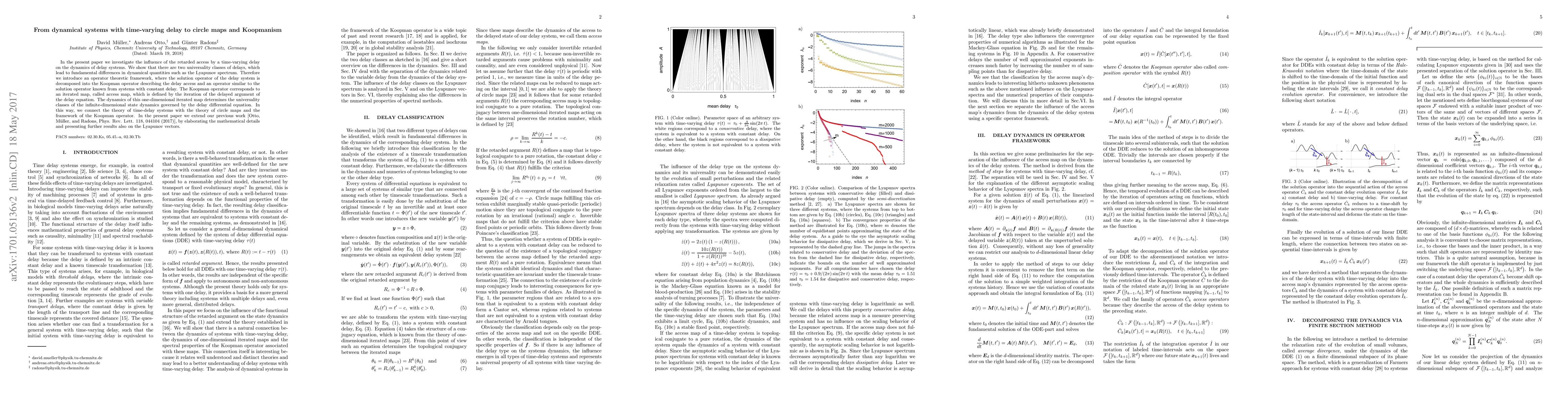 In the present paper we investigate the influence of the retarded access by a time-varying delay on the dynamics of delay systems. We show that there are two universality classes of delays, which lead to fundamental differences in dynamical quantities such as the Lyapunov spectrum. Therefore we introduce an operator theoretic framework, where the solution operator of the delay system is decomposed into the Koopman operator describing the delay access and an operator similar to the solution operator known from systems with constant delay. The Koopman operator corresponds to an iterated map, called access map, which is defined by the iteration of the delayed argument of the delay equation. The dynamics of this one-dimensional iterated map determines the universality classes of the infinite-dimensional state dynamics governed by the delay differential equation. In this way, we connect the theory of time-delay systems with the theory of circle maps and the framework of the Koopman operator. In the present paper we extend our previous work [Otto, M\"uller, and Radons, Phys. Rev. Lett. 118, 044104 (2017)], by elaborating the mathematical details and presenting further results also on the Lyapunov vectors.