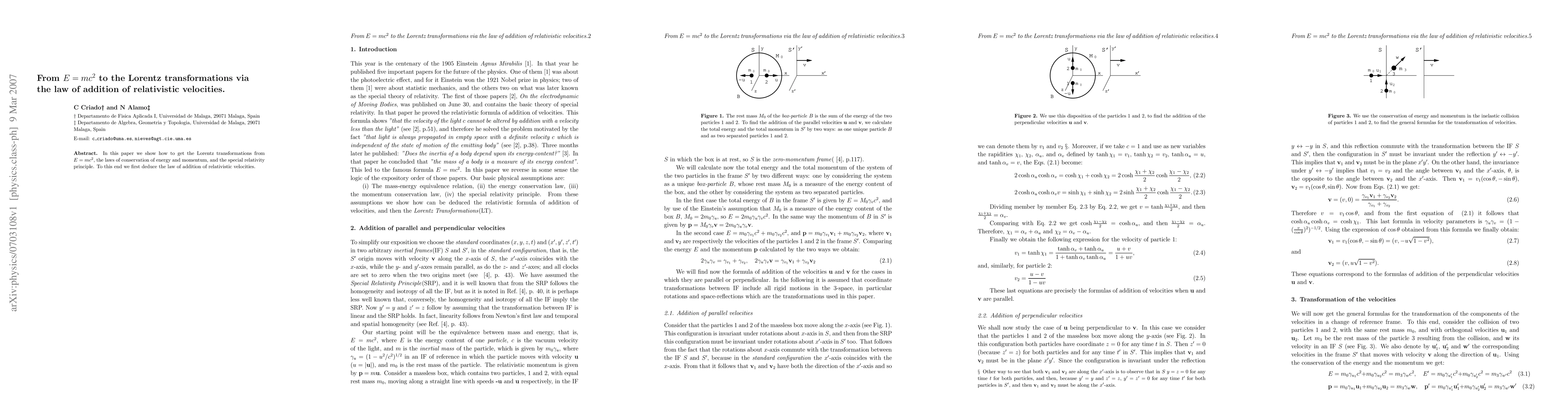 This paper shows how to derive the Lorentz transformations from E=mc^2, conservation laws, and special relativity, focusing on the law of addition of relativistic velocities.