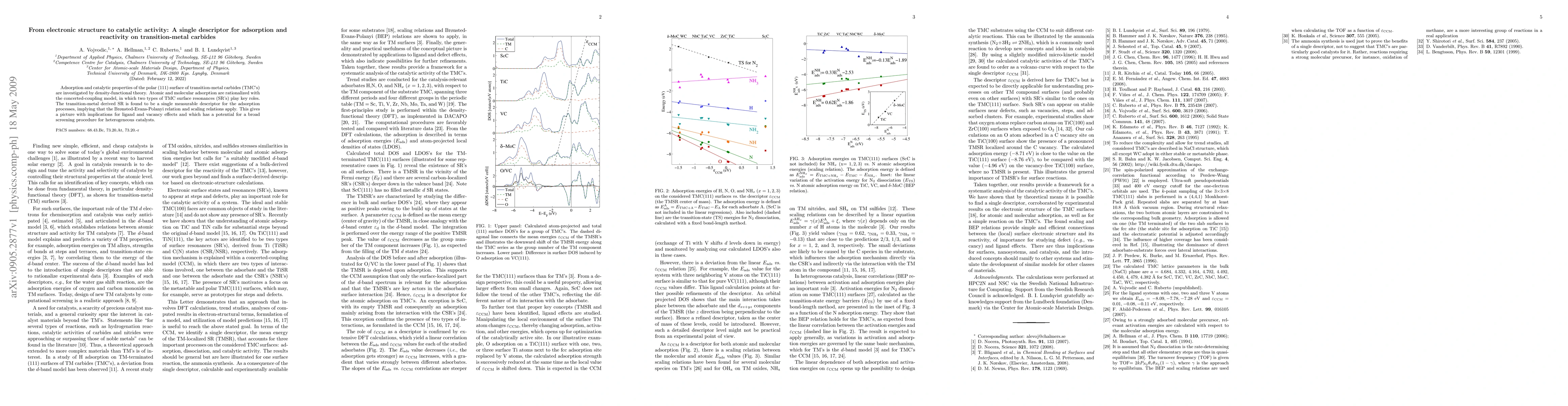 Adsorption and catalytic properties of the polar (111) surface of transition-metal carbides (TMC's) are investigated by density-functional theory. Atomic and molecular adsorption are rationalized with the concerted-coupling model, in which two types of TMC surface resonances (SR's) play key roles. The transition-metal derived SR is found to be a single measurable descriptor for the adsorption processes, implying that the Br{\o}nsted-Evans-Polanyi relation and scaling relations apply. This gives a picture with implications for ligand and vacancy effects and which has a potential for a broad screening procedure for heterogeneous catalysts.